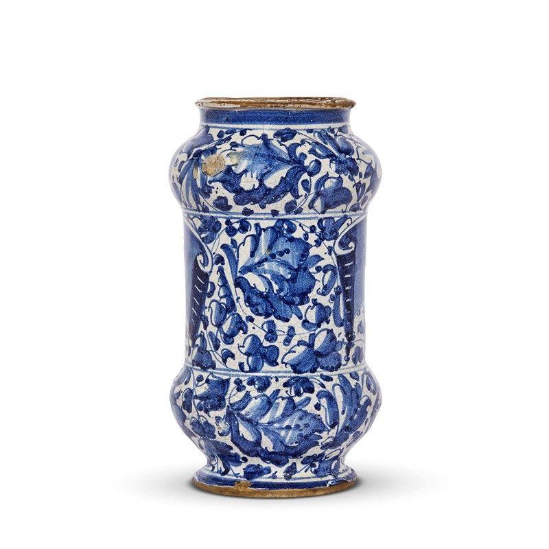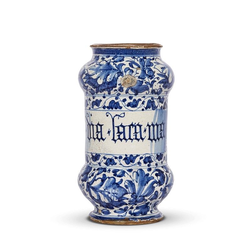 in maiolica dipinta in monocromia, forma a rocchetto con corpo cilindrico rastremato al centro e spalla e calice fortemente arrotondati, base piana e collo breve e dritto. Il decoro, su fondo smaltato bianco crema, mostra un cartiglio sulla fascia centrale con iscrizione farmaceutica in caratteri gotici delineati in blu, attorno al quale si sviluppa una sequenza di foglie e grandi boccioli vegetali dal profilo sagomato. Un albarello rinvenuto a Castro coerente per morfologia e decoro, che condivide con il vaso in oggetto la cura della decorazione, è stato attribuito alle prolifiche botteghe della città di Roma che dalla seconda metà del Cinquecento lavoravano grazie all’apporto di artigiani provenienti da tutta la penisola; alt. cm 20,4, diam. bocca cm 8,3, diam. piede cm 8,5