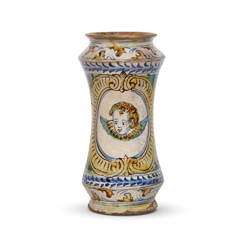 in maiolica dipinta in policromia, corpo ovoidale affusolato poggiante su un alto piede dalla base piana, collo alto cilindrico con labbro rigonfio appena estroflesso. Sul fronte è dipinto un cherubino su fondo maiolicato entro una cornice baccellata, mentre al retro si sviluppa un motivo trofei delineati con grande rapidità. Il colore è steso con parsimonia e i modi pittorici sono quelli delle botteghe saccensi attive nel XVII secolo; alt. cm 27,5, diam. bocca cm 11,2, diam. piede cm 10,7