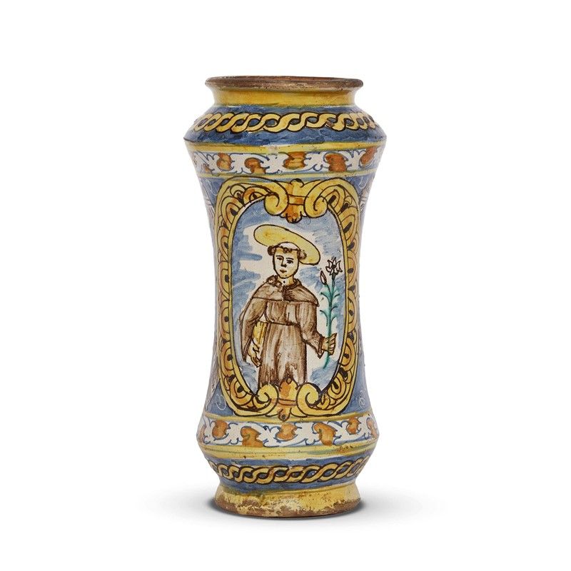 in maiolica dipinta in policromia, corpo cilindrico appena rastremato al centro, collo breve con bocca circolare dall’orlo svasato e piano, piede basso appena svasato. Sul fronte spicca la raffigurazione di sant’Antonio su fondo azzurro, il tutto entro un medaglione racchiuso in cornice baccellata; al retro invece una teoria di trofei, con pochi elementi di grandi dimensioni su fondo blu e cartiglio con scritta PSQ unito a una A. I modi pittorici sono quelli dell’ormai consolidata tradizione siciliana che, ispirata alle maioliche faentine, si sviluppa in forme stilistiche diversificate. Ci pare di poter associare l’opera a una bottega attiva nella città di Sciacca nel XVII secolo per alcuni accenti stilistici, ma anche per una scelta cromatica che ben si attaglia con la produzione della città siciliana; alt. cm 29, diam. bocca cm 10,6, diam. piede cm 9,8