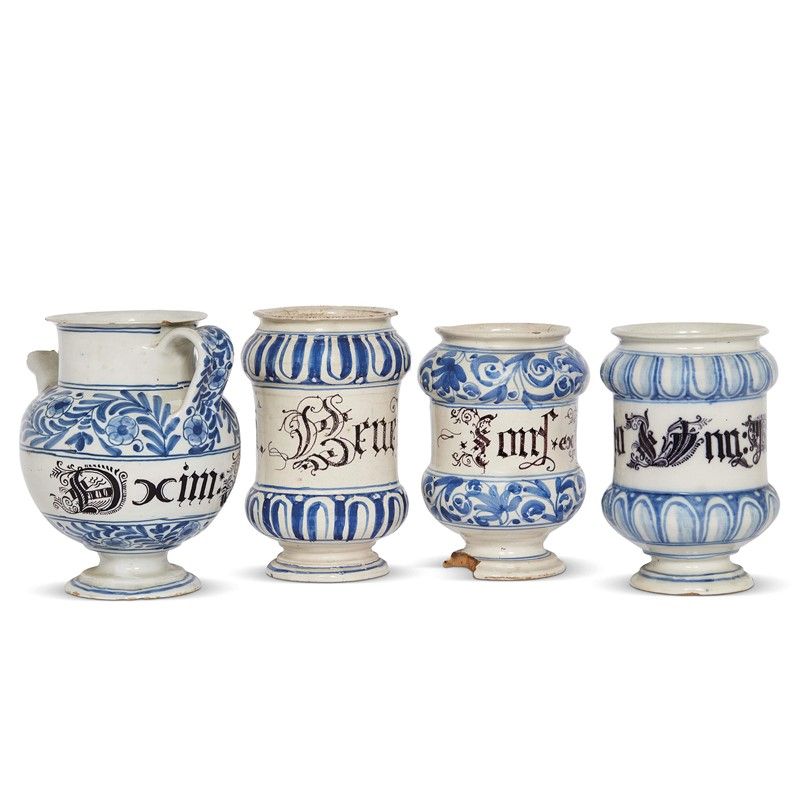 in maiolica dipinta in policromia costituito da un albarello e tre versatoi; albarelli a rocchetto con strozzatura centrale, orlo estroflesso e piede basso con base concava, versatoio di forma ovoidale con alto collo cilindrico, presa a nastro e cannello diritto. La decorazione in blu di cobalto prevede due larghe fasce, dipinte con un motivo continuo a baccellature oppure con motivo a ramage fogliato con grandi fiori multipetalo, e tra le due fasce la scritta farmaceutica redatta in ossido di manganese in caratteri gotici; linee parallele sottolineano il piede. Entrambe le tipologie di decoro hanno caratterizzato la produzione delle fornaci bassanesi, alle quali riteniamo corretto assegnare la loro realizzazione. Albarelli alt. cm 19,4, cm 18,5 e cm 18,2; versatoio alt. cm 19,5