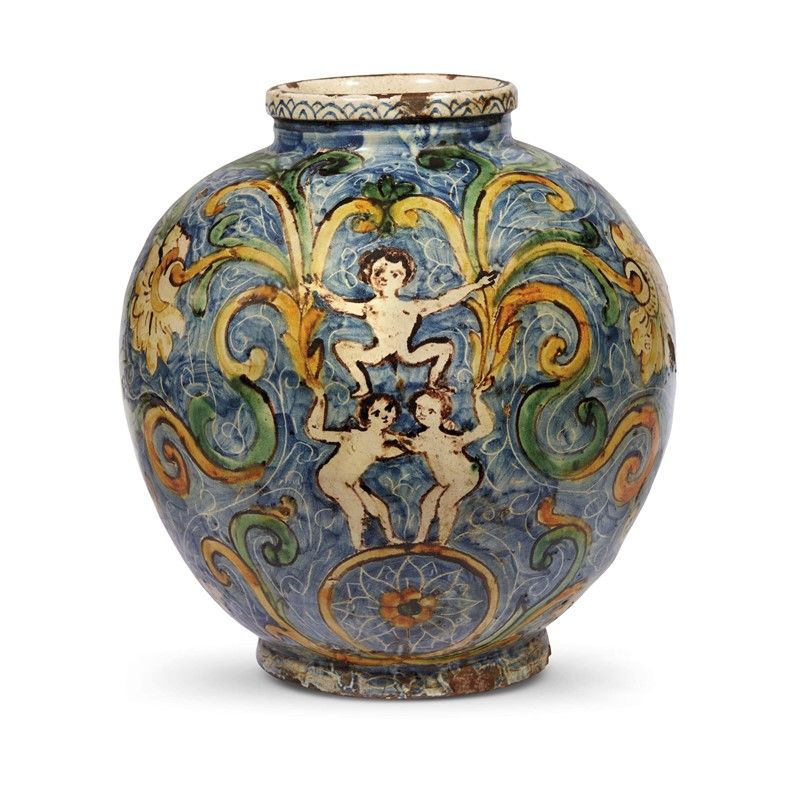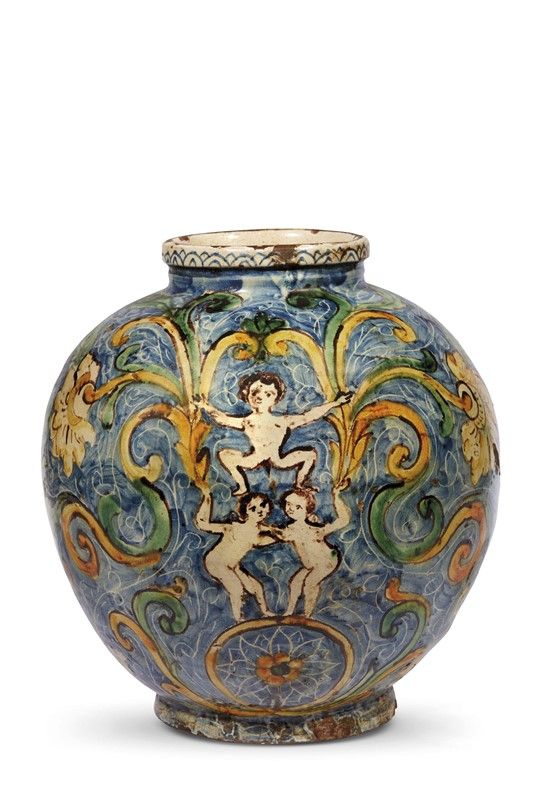 in maiolica dipinta in blu di cobalto, giallo antimonio, verde ramina con tocchi di bruno di manganese. Il vaso ha la caratteristica forma a bombola con imboccatura tonda poco allargata e orlo a cordolo, spalla che scende direttamente fondendosi nel corpo globulare poggiante su un piede basso schiacciato con base piana. Il decoro mostra un motivo a girali fogliate allargate con boccioli di fiori a petali sfogliati che si distribuiscono attorno a un motivo decorativo con tre acrobati che formano una piramide umana, al di sotto della quale si vede un medaglione circolare con un motivo floreale stilizzato. Anche in questo caso è da sottolineare l’originalità del decoro proposto, a variare la consueta decorazione veneziana; alt. cm 35,5, diam. bocca cm 15, diam. piede cm 17,8