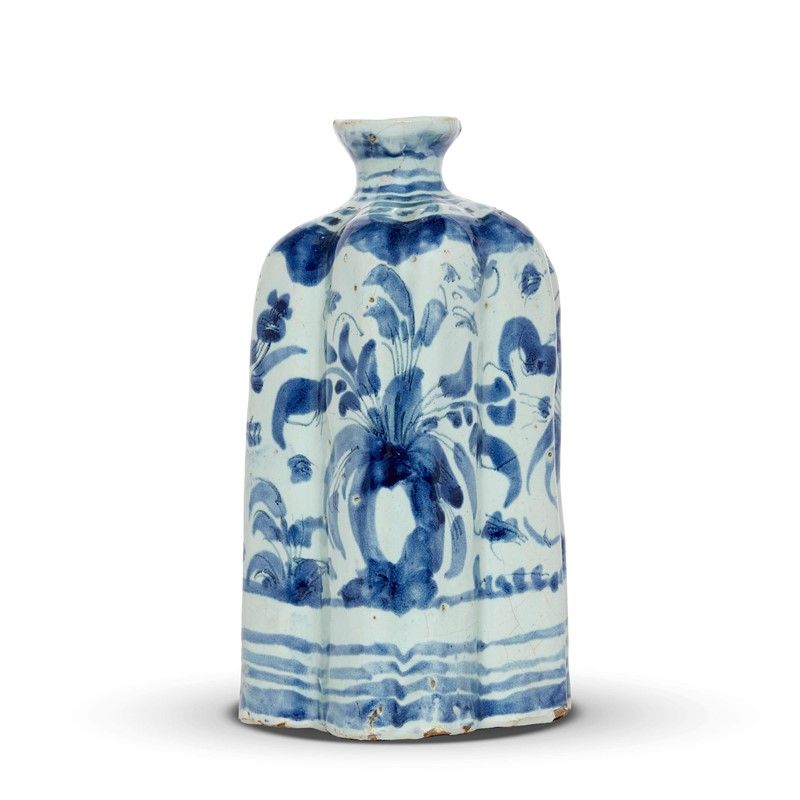 in maiolica dipinta in monocromia blu, corpo di forma quadrata con collo breve e stretto che si apre in una imboccatura con orlo estroflesso. La decorazione monocroma, realizzata su fondo azzurrato, propone il caratteristico ornato orientalizzante a tappezzeria con motivi fitomorfi, decoro che trova riscontro nella produzione ligure della seconda metà del Seicento. Sotto la base lettera G in blu; alt. cm 25,5, base cm 11,5x11,5