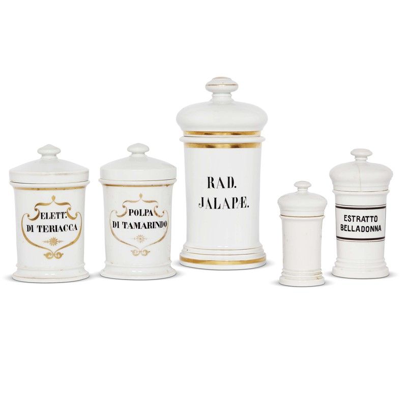 in porcellana bianca, appartenenti ad una produzione di grande successo nota in manifattura come “vasi cilindrici con coperchio a borsa”. Sono qui rappresentate varie tipologie morfologiche con differenziazione nella forma del coperchio e nella decorazione: acromo, con cartiglio semplice, con cartiglio racchiuso in cornice dorata sagomata oppure con scritta apotecaria senza cartiglio, e decoro in oro a fasce concentriche; alt. cm 26, cm 17,2 (2), cm 16,8, cm 13