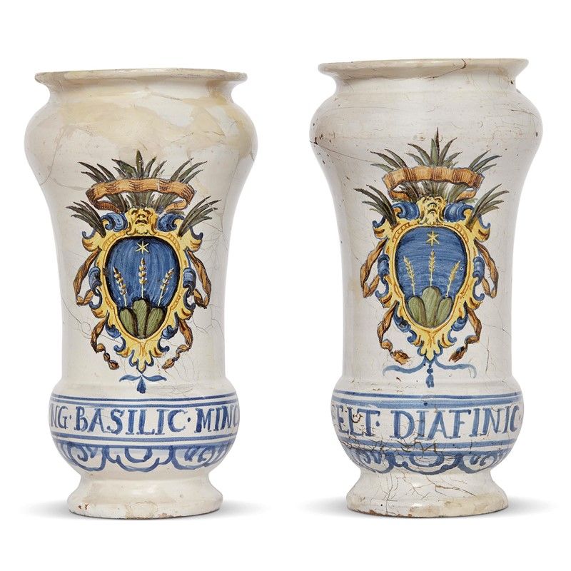 in maiolica dipinta in policromia, corpo cilindrico slanciato, leggermente rastremato al centro con piede carenato e base piana, collo breve e orlo estroflesso su spalla rigonfia. I due vasi, appartenenti alla medesima spezieria, mostrano sul fronte un emblema entro cornice rocaille sormontata da un mascherone e un decoro fitoforme entro un nastro che scende per ornare i lati dello stemma, al cui interno è un trimonte con tre spighe di grano e una stella; sul calice corrono i cartigli farmaceutici in blu cobalto redatti in lettere capitali; alt. cm 25,5, diam. bocca cm 12, diam. piede cm 9