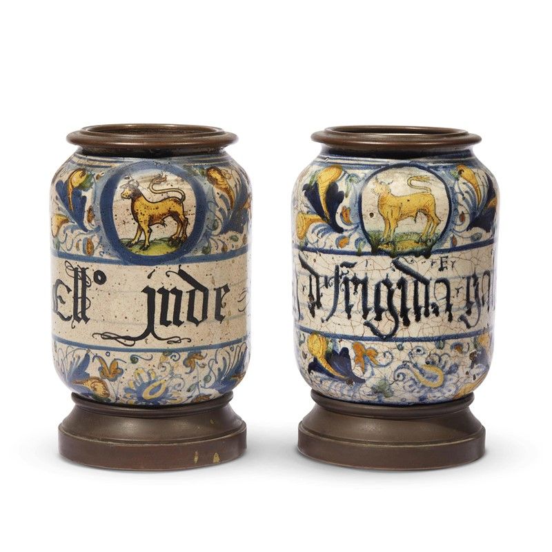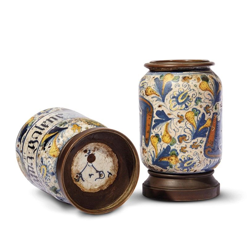 in maiolica dipinta in policromia, il corpo cilindrico e rigonfio si conclude in un calice arrotondato, con collo breve che scende su una spalla arrotondata. Il piede basso ha base concava sotto al quale è dipinta la sigla della bottega, con le iniziali RB unite da un segno a V rovesciata, riconducibili al vasaio Rocco Bentivoglio Rondinini di Siena, operante per molti anni a Pesaro. Il decoro a policromia occupa tutta la superficie dei vasi con un motivo a palmetta persiana policroma, a circondare nella fascia superiore un medaglione con un toro. I cartigli sono redatti in lettere gotiche in nero di manganese. I due vasi appartenevano a un noto e importante corredo farmaceutico e annoverano esemplari di confronto in musei e collezioni private. Si tratta di produzione pesarese con forti influssi veneziani, presente soprattutto nella decorazione a grossi frutti e fogliami. Il corredo apotecario è caratterizzato dal medaglione con l’emblema del toro, che alcuni associano all’arma degli Hondedei di Pesaro. Montati con applicazioni in bronzo alla base e sull’orlo; alt. cm 22,5, diam. bocca cm 12, diam. piede cm 13 (compresa la montatura)