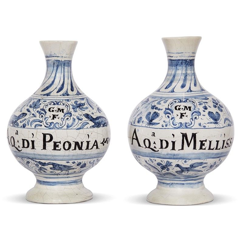 in maiolica policroma, corpo globulare schiacciato espanso al centro e rastremato verso il piede, che è largo basso, collo cilindrico appena assottigliato al centro con imboccatura rotonda con labbro appena estroflesso. Il decoro è interamente realizzato su fondo bianco con scritta farmaceutica al centro, circondata da una fitta decorazione con elementi fitomorfi e piccoli animali e insetti dipinti in blu. Sopra al cartiglio, che termina con il caratteristico motivo a bastone di arrotolamento, al centro è dipinto un emblema farmaceutico in cornice a cartouche con lettere G.M.F. Le fiasche trovano confronto in esemplari molto simili di produzione faentina con decoro “calligrafico” della fine del secolo XVII; alt. cm 23,2, diam. bocca cm 5,5, diam. piede cm 9,8