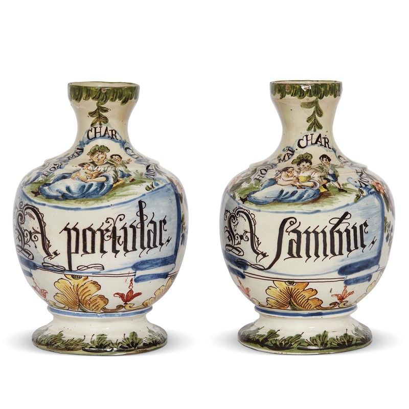 in maiolica dipinta in policromia, corpo globulare con alto collo terminante in un’imboccatura arrotondata, poggianti su basso calice con piede arrotondato a base concava. Il decoro vede la raffigurazione di donna che allatta accompagnata da altri infanti e sormontata dalla scritta CHAR, il tutto posto sopra il cartiglio farmaceutico iscritto in caratteri gotici; tutto intorno una fitta decorazione policroma con ghirlande di rose e larghe foglie, mentre gli orli sono decorati da un motivo a foglie. Questi vasi appartengono al corredo farmaceutico dell’Ospedale Maggiore della Carità di Novara, di cui alcuni esemplari sono conservati nel Museo Civico di Novara, al Museo Civico di Torino e ad Oxford, oltre ad un grande vaso alle raccolte di Arte Applicate del Castello Sforzesco di Milano, ma la maggior parte in raccolte private. Il corredo, per molto tempo attribuito a maestranze lodigiane, ha trovato giusta attribuzione grazie a uno studio di Sacchi (1860) e soprattutto alla schedatura del vaso milanese a cura di Raffaella Ausenda, che grazie a un’accurata analisi del decoro e della forma ha portato definitivamente l’attribuzione alla fabbrica milanese di Felice Clerici, anche in virtù di una coincidente descrizione del decoro negli archivi della manifattura; alt. cm 23,6, diam. bocca cm 6,5, diam piede cm 12,6