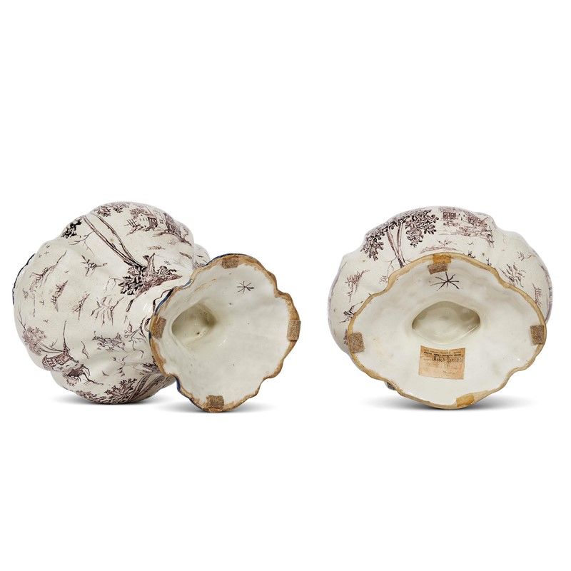in maiolica dipinta in monocromia bruno di manganese, corpo a balaustro rigonfiato a due terzi dell’altezza a sezione polilobata, alto piede sagomato, collo breve che si apre in una imboccatura appena estroflessa a sorreggere coperchio a cupola polilobato con elementi a rilievo attorno alla presa a forma bottone. Il decoro interessa il corpo e il coperchio con un motivo a paesaggio con architetture e grandi alberi uniti a uccelli e piccoli insetti, secondo una tipologia spesso presente in vasi simili, prodotti dalle manifatture liguri con varie funzioni, da contenitori a oggetti di decorazione o pout-pourri. Alcuni confronti con decori impreziositi da figurine alla Callot, ma di minor impatto decorativo rispetto alla coppia in oggetto di studio, ci derivano dalle principali raccolte pubbliche e private, come ad esempio da alcuni vasi presenti nei musei di Genova. Marca asterisco in manganese sotto la base di entrambe i vasi; un vaso riporta etichetta ENTE PROVINC. TURISMO GENOVA / MOSTRA ANTICA MAIOLICA LIGURE con il nome dell’espositore Nino Ferrari; alt. cm 31,5, base cm 16,2x13,5