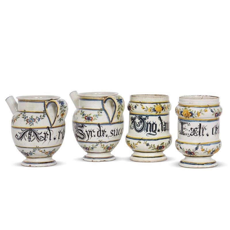 in maiolica dipinta in policromia, gli albarelli con corpo a rocchetto con strozzatura di forma cilindrica piuttosto alta su piede a calice, gli orcioli con corpo ovoidale e alto collo cilindrico appena rastremato che si apre in una larga imboccatura dall’orlo estroflesso, piede basso con base concava e modanatura a scozia, larga ansa nastriforme contrapposta al beccuccio lungo e dritto. Il decoro “a fascia” mostra un motivo a ghirlanda di gusto neoclassico, di grande eleganza formale e stilistica, mentre la fascia centrale è occupata dal cartiglio con iscrizione farmaceutica in caratteri gotici. Questi vasi trovano riscontro nella produzione della manifattura piemontese Rossetti o di quella Ardizzone, e proprio in un orciolo da farmacia siglato da questa ultima manifattura, conservato nella collezione Appendino di Torino, è attestata analoga morfologia. Albarelli alt. cm 17,5, diam. bocca cm 10,6, diam. piede cm 10,2; versatoi alt. cm 18,2, diam. bocca cm 11,8, diam. piede cm 9,4