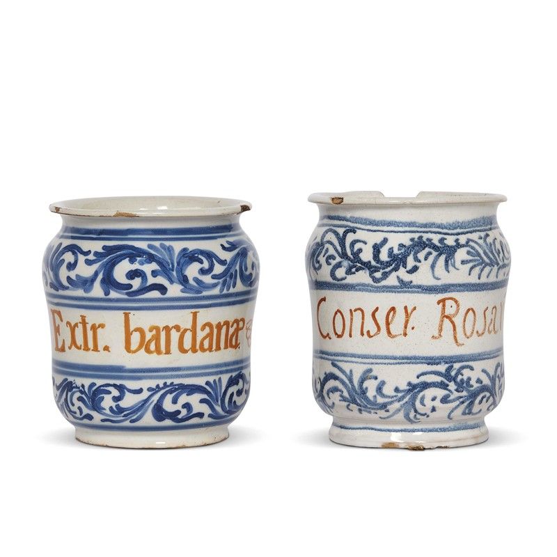 in maiolica dipinta in policromia, corpo dalla forma cilindrica appena rastremata al centro, basso piede piano e imboccatura larga con orlo estroflesso su basso collo cilindrico. La decorazione è dipinta in monocromia blu di cobalto con fasce a tralci fogliati disposte a chiudere l’iscrizione farmaceutica, posta centralmente e redatta in giallo. Sono noti esemplari analoghi con marca Lanterna. Uno dei due vasi è siglato sul fondo GB, l’altro F; alt. cm 11,6, diam. bocca cm 9,2, diam. piede cm 7,4 e alt. cm 11,2, diam. bocca cm 9,6, diam. piede cm 7,1