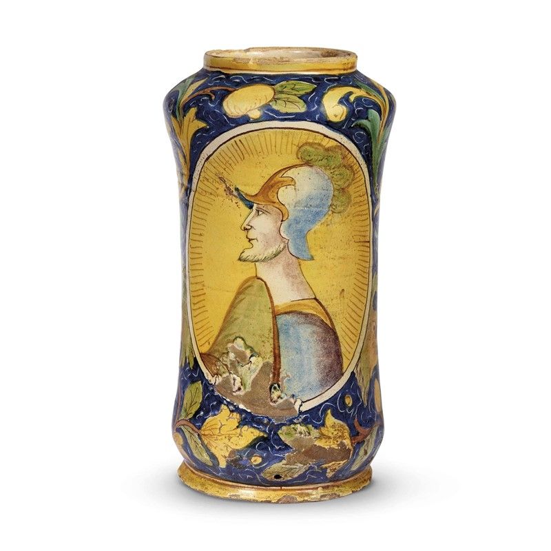 in maiolica decorata in blu di cobalto, giallo antimonio, verde ramina. La forma a cilindrone prevede larga imboccatura con orlo dritto, collo breve, basso piede a base piana. Sul fronte un busto di guerriero con elmo e viso barbato, conchiuso in un medaglione ovale con una sottile cornice lineare lasciata a risparmio; tutto intorno girali fogliate con fiori dipinti secondo l’uso “alla veneziana”, con prevalenza del giallo su fondo blu decorato con sottili incisioni a fondo di pennello; alt. cm 41,4, diam. bocca cm 15, diam. piede cm 19
