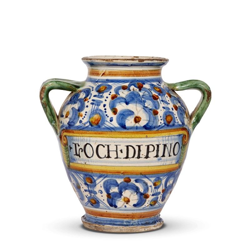 in maiolica dipinta in policromia, corpo ovoidale su piede a disco, breve colletto svasato con orlo estroflesso, due anse a nastro angolate scendono dalla spalla fino al punto di massima espansione del ventre. L’intera superficie mostra il caratteristico decoro a “palmetta persiana”, delimitato sul collo e alla base da una serie di filetti sovrapposti delineati in azzurro, giallo e arancio, e interrotto sul fronte da un cartiglio rettangolare con estremità arrotolate che racchiude l’iscrizione farmaceutica, redatta a lettere capitali in manganese; alt. cm 17,6, diam. bocca cm 8,7, diam. piede cm 8,2