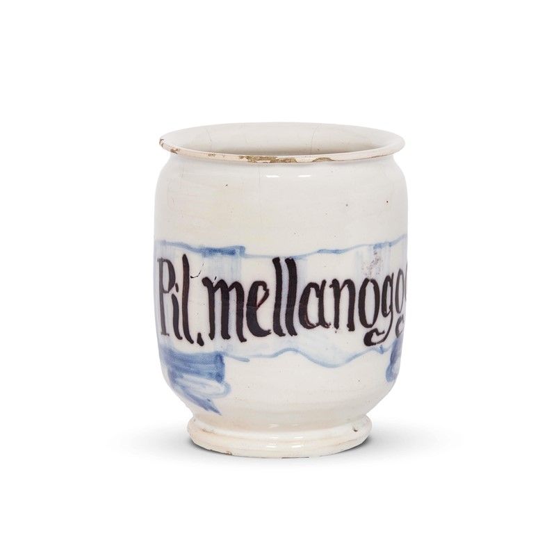 PICCOLO ALBARELLO, FAENZA, INIZI SECOLO XVIII in maiolica dipinta in policromia, corpo cilindrico rigonfio al centro con piede a disco e collo breve con imboccatura a orlo sottile e estroflesso. Il decoro si limita alla fascia centrale con scritta apotecaria in corsivo entro cartiglio appena ombreggiato di azzurro. La forma e il decoro sono coerenti con le produzioni faentine dei primi anni del XVIII secolo; alt. cm 10, diam. bocca cm 8, diam. piede cm 5,7