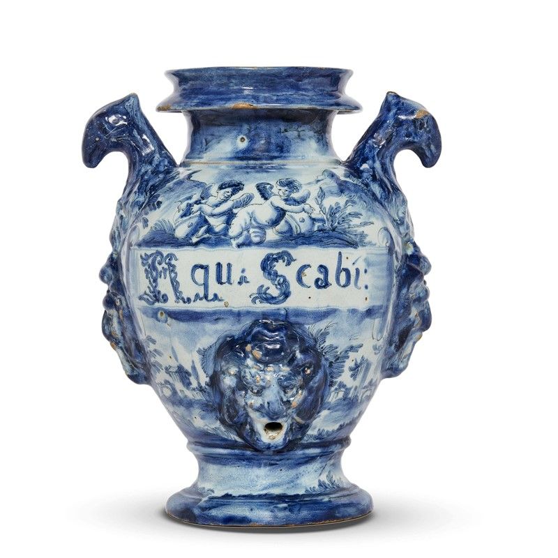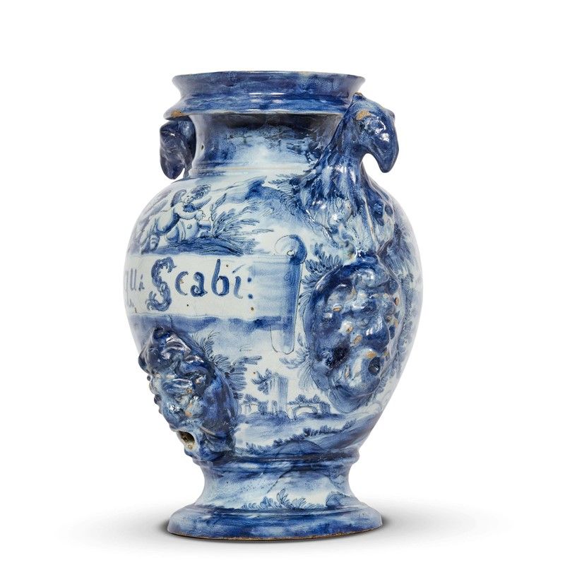 in maiolica dipinta in monocromia, corpo ovoidale con bocca e piede estroflessi, anse a testa di grifone innestate al di sopra dei mascheroni satireschi a rilievo, mentre al centro in basso è posto un terzo mascherone a gola forata per l’inserimento di una spina metallica a rubinetto per prelevate il preparato apotecario; l’imboccatura presenta un anello cilindrico che doveva sorreggere un coperchio o consentire la copertura del vaso. Il decoro in monocromia blu di cobalto è del tipo “istoriato barocco” con gioco di putti in un paesaggio con casolari, interrotto sopra il mascherone dal cartiglio con scritta farmaceutica in lettere corsive. La forma è quella tipica dei grandi vasi farmaceutici liguri, atti a contenere liquidi e preparati fluidi, che tanto successo ebbero nel Seicento e nel secolo successivo, periodo nel quale ci pare di ravvisare una vicinanza stilistica con le produzioni della fornace Veneziano; alt. cm 36, diam. bocca cm 15,2, diam. piede cm 16,8