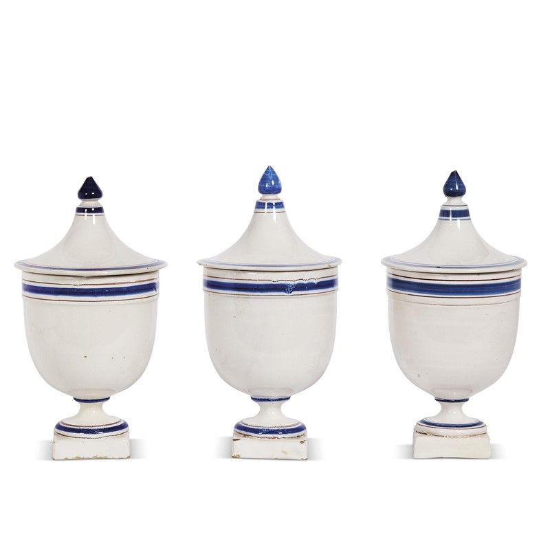 in maiolica smaltata di bianco con decoro in blu. I tre vasi hanno corpo ovoidale su basso piede a calice poggiante su base quadrangolare, larga imboccatura che sostiene un coperchio alto a cuspide dotato di pomolo a pigna. La decorazione è limitata a fasce concentriche lungo l’orlo, al piede e sul pomolo; alt. cm 28, diam. bocca cm 13
