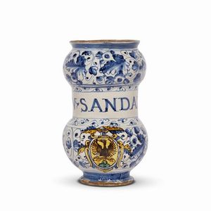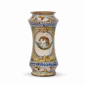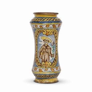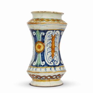 ALBARELLO, ROMA, PRIMA METÀ SECOLO XVII in maiolica dipinta in policromia, di forma a rocchetto con corpo [..]
