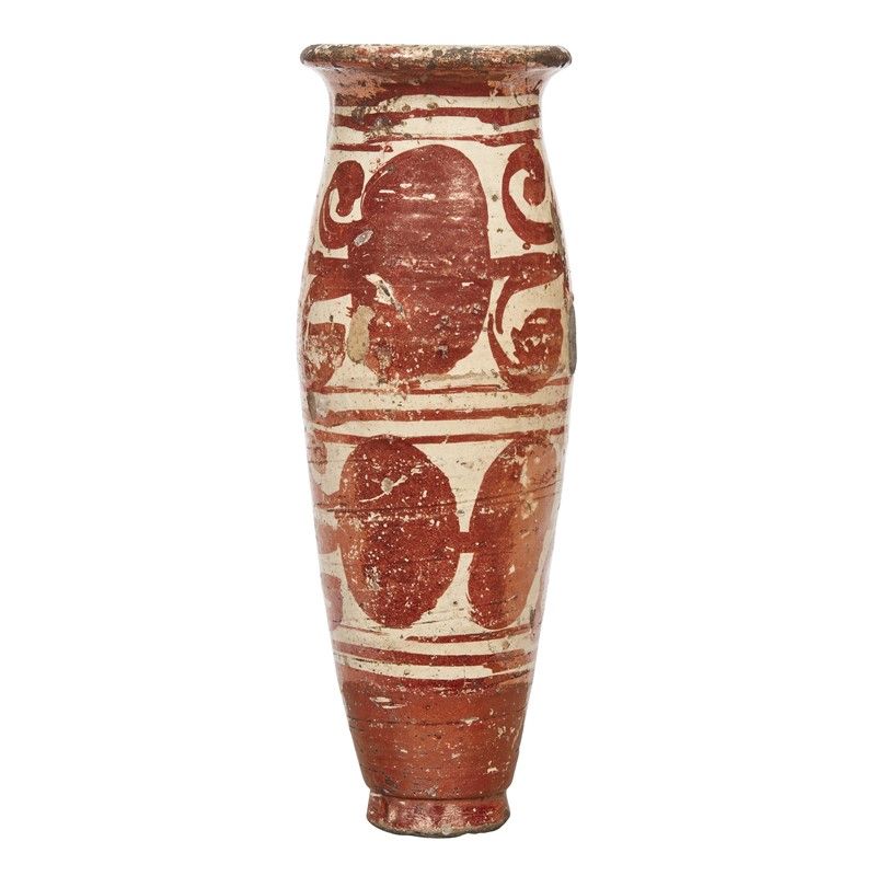 in maiolica decorata in lustro metallico; sottile corpo cilindrico di forma allungata con orlo estroflesso, decorato sull’intera superficie da motivi geometrico che si sviluppano su un doppio registro delimitato da linee parallele. Questa tipologia di vaso non aveva funzione farmaceutica, ma più probabilmente era utilizzata per la conservazione del miele o delle confetture; alt. cm 24, 5, diam. bocca cm 8,5, diam. piede cm 4,5