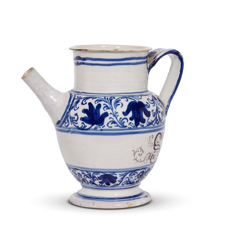 in maiolica dipinta in monocromia blu con iscrizione in manganese, corpo ovoidale con alto collo cilindrico appena rastremato che si apre in una larga imboccatura dall’orlo estroflesso con labbro sottile e arrotondato, piede basso con collo largo, base concava e orlo arrotondato con modanatura a scozia, larga ansa nastriforme contrapposta al beccuccio dritto dal profilo troncoconico. Il decoro, che si sviluppa intorno al cartiglio centrale, mostra un motivo sinuoso fitomorfo con boccioli sfrangiati e piccoli frutti, motivo che si ripete anche sull’ansa caratterizzata da emblema farmaceutico con le chiavi e la tiara di San Pietro. L’orciolo, probabilmente proveniente da un corredo farmaceutico legato al Vaticano, è di produzione dell’Italia settentrionale verso la fine del XVII secolo, confermata dai confronti morfologici e stilistici, che portano verso il Veneto e nello specifico alle prolifiche e richieste manifatture di Nove di Bassano. L’attenzione nella redazione del decoro trova riscontro anche nella scritta farmaceutica a caratteri godici redatti con cura, a conferma dell’importanza della committenza, e tale da permettere che l’orciolo fosse comunque immesso sul mercato nonostante i difetti di cottura; alt. cm 20,6, diam. bocca cm 11, diam. piede cm 11
