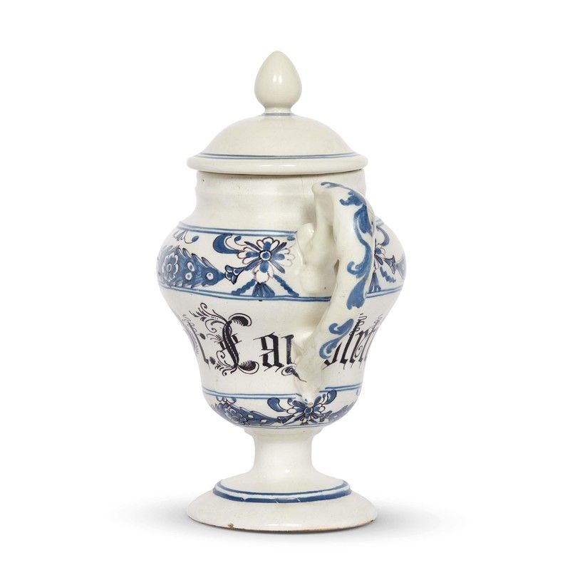 in maiolica dipinta in policromia, corpo a pera capovolta su alto piede dal collo stretto con base modanata a scozie; il collo alto e cilindrico termina in un labbro arrotondato rastremato, che sorregge un coperchio a cupola con pomolo a pigna. Il decoro, distribuito in due fasce, propone il caratteristico motivo a ghirlande redatte in blu cobalto e fermate da grande fiore multipetalo, mentre la fascia centrale è dedicata alla scritta farmaceutica redatta in bruno di manganese in caratteri gotici. Esemplari simili per la forma, con decorazione a tralcio fiorito, sono conservati nelle Raccolte del Castello Sforzesco di Milano; alt. cm 23, diam. bocca cm 8, diam. piede cm 9,2