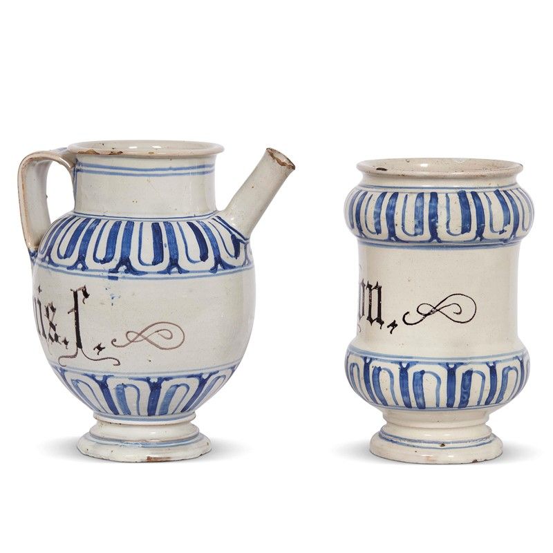 in maiolica dipinta in policromia; versatoio di forma ovoidale con alto collo cilindrico, presa a nastro e cannello diritto; albarello a rocchetto con strozzatura centrale, orlo estroflesso e piede basso con base concava. Il decoro “a fascia” occupa le parti bombate con un motivo a finta baccellatura in chiaroscuro con embricazioni larghe in monocromia blu di cobalto, presente anche sull’ ansa dell’orciolo, mentre la zona centrale, che ospita la scritta apotecaria in caratteri gotici, è sormontata da un emblema farmaceutico a policromia con un piccolo albero in cornice ovale accompagnato dalle lettere C.C.I. I vasi sono morfologicamente coerenti e probabilmente provenienti da un medesimo corredo farmaceutico. Un albarello coerente, ma con emblema differente, conservato al Museo della Scienza e della Tecnica Leonardo da Vinci di Milano, ci sostiene nell’attribuzione alle manifatture di Bassano; versatoio alt. cm 20,5, diam. bocca cm 10,3, diam. piede cm 8,8; albarello alt. cm 19,5, diam. bocca cm 10,8, diam. piede cm 8,7