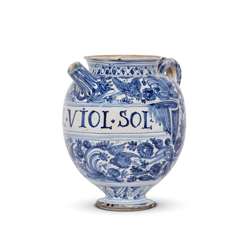 in maiolica dipinta in monocromia, corpo di forma ovoidale su piede piano e espanso, dalla spalla si innalza un cannello breve e cilindrico, mentre il collo è cilindrico e termina in un orlo appena aggettante; ansa a doppia corda desinente a ricciolo. Il decoro calligrafico naturalistico riprende con attenzione le modalità caratteristiche della produzione tipica delle manifatture liguri, che ebbero enorme successo e diffusione interessando trasversalmente la produzione di maioliche dall’Italia settentrionale fino alle manifatture toscane, romane e marchigiane. La morfologia dell’opera ci porta a pensare alla produzione di una delle fornaci romane o laziali del XVII secolo; alt. cm 19,8, diam. bocca cm 10,2, diam. piede cm 7,6