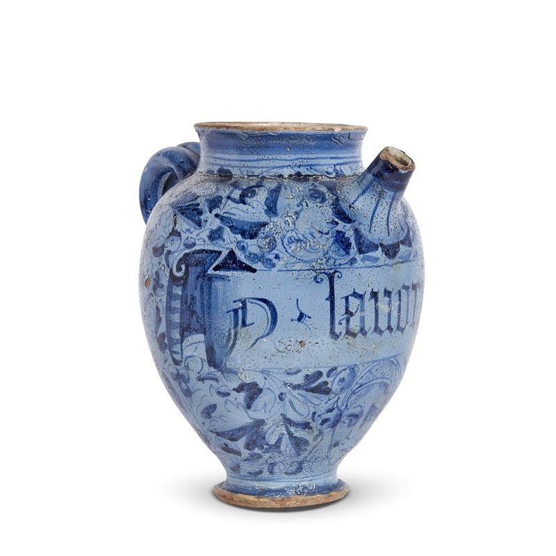 in maiolica dipinta in monocromia, corpo ovoidale su piede piano e espanso, il collo cilindrico con orlo appena aggettante, ansa a doppia corda desinente a ricciolo, cannello breve e cilindrico. L’orciolo è decorato su fondo smaltato berettino con motivo fitomorfo con foglie bipartite e fruttini, a circondare un cartiglio sinuoso iscritto in caratteri gotici. Il confronto morfologicamente più vicino è costituito da un orciolo della collezione Bayer di Milano, con caratteristiche stilistiche e esito produttivo più riuscito: nel nostro caso lo smalto è ruvido e di scarsa lucentezza, ma la produzione è comunque quella delle fornaci romane del secolo XVII; alt. cm 21,5, diam. bocca cm 9,7, diam. piede cm 7,6