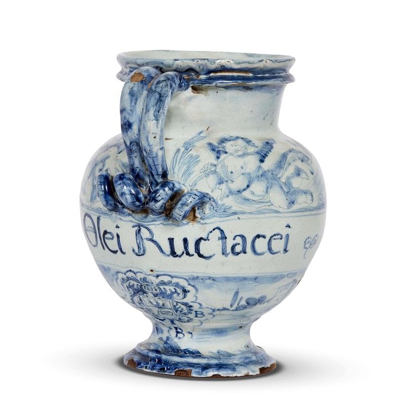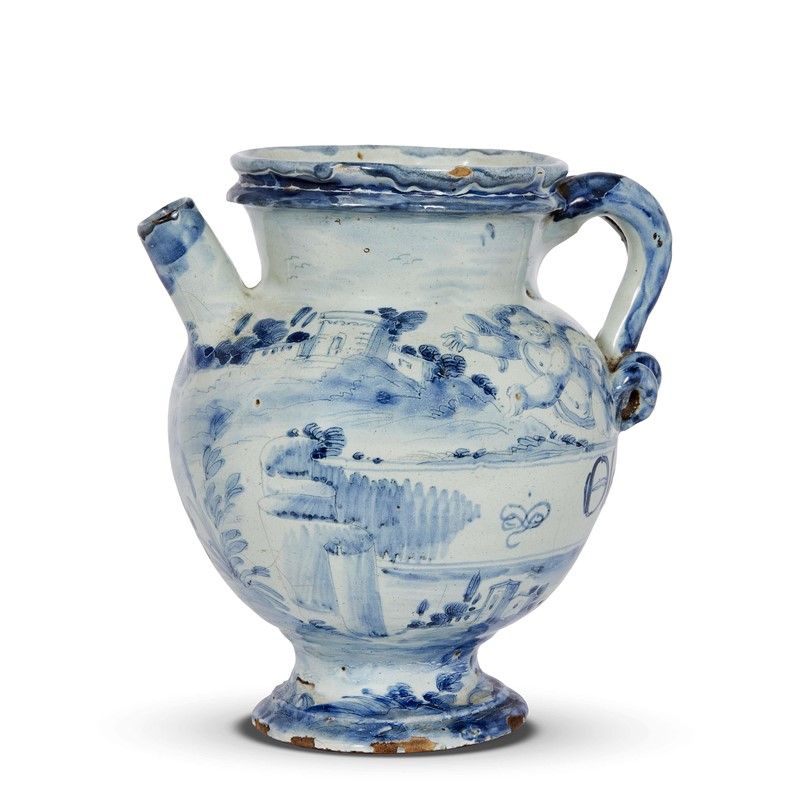 in maiolica monocroma, corpo ovoidale rastremato verso un basso piede allargato, collo cilindrico svasato con orlo a doppio nastro, ansa a doppio cordone con terminali a ricciolo e cannello cilindrico. Il decoro è quello tipico con motivo a figure in paesaggio, sviluppato attorno a un cartiglio con iscrizione farmaceutica. Sotto il cartiglio uno stemma sormontato da elmo entro ricca cornice, accompagnato da lettere capitali. Marca stemma crociato sotto il piede; alt. cm 21,5, diam. bocca cm 12,4, diam. piede cm 11,5