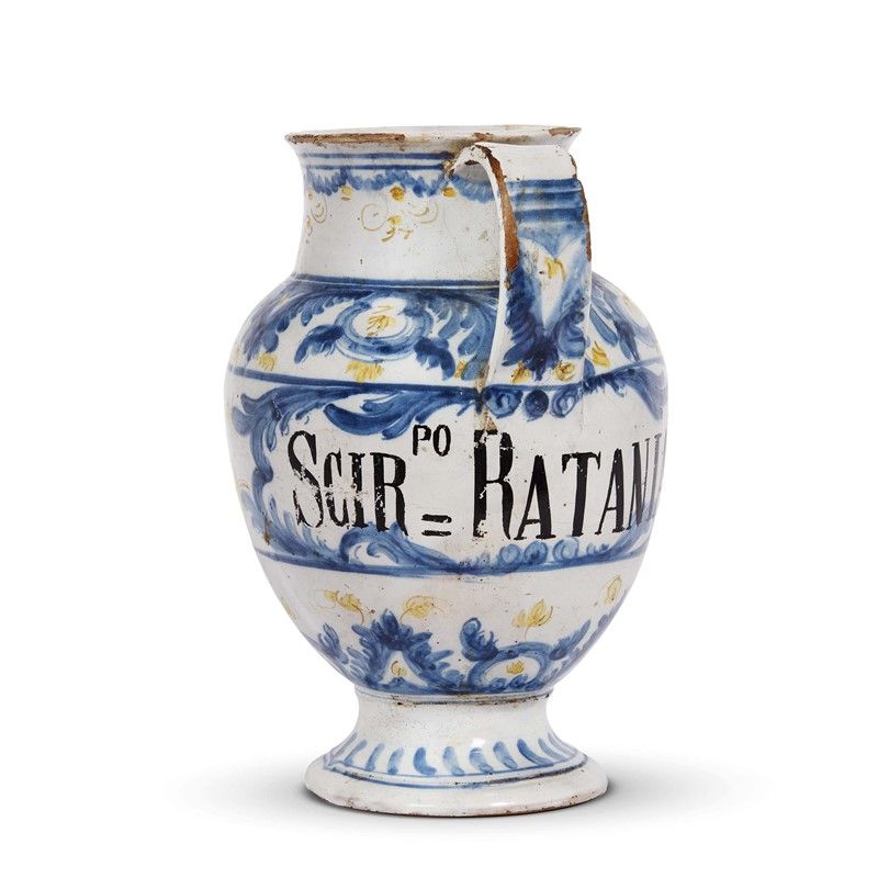 in maiolica dipinta in policromia, corpo globulare allungato, collo cilindrico alto e bocca larga con orlo appena aggettante, poggiante su un alto piede a calice; dal collo parte un’ansa breve a nastro, mentre sul fronte è collocato un cannello cilindrico breve e sottile. L’ornato si sviluppa a fasce parallele attorno al cartiglio, scritto in stampatello in bruno di manganese e collocato sotto l’ansa, abbellito da una cornice ovale a rocaille. Nelle fasce corre poi un motivo a rocaille in blu e giallo, mentre un decoro minore circonda l’imboccatura e alcuni tratti dipinti con rapidità sottolineano il piede. Per la morfologia e la tipologia decorativa, qui piuttosto generica e corriva, l’opera si può collocare nell’ambito produttivo delle officine torinesi della metà del XVIII secolo; alt. cm 24, diam. bocca cm 10,2, diam. piede cm 10,8