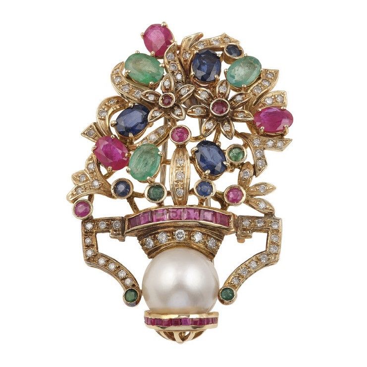 Spilla/pendente con diamanti, gem-set e perla coltivata