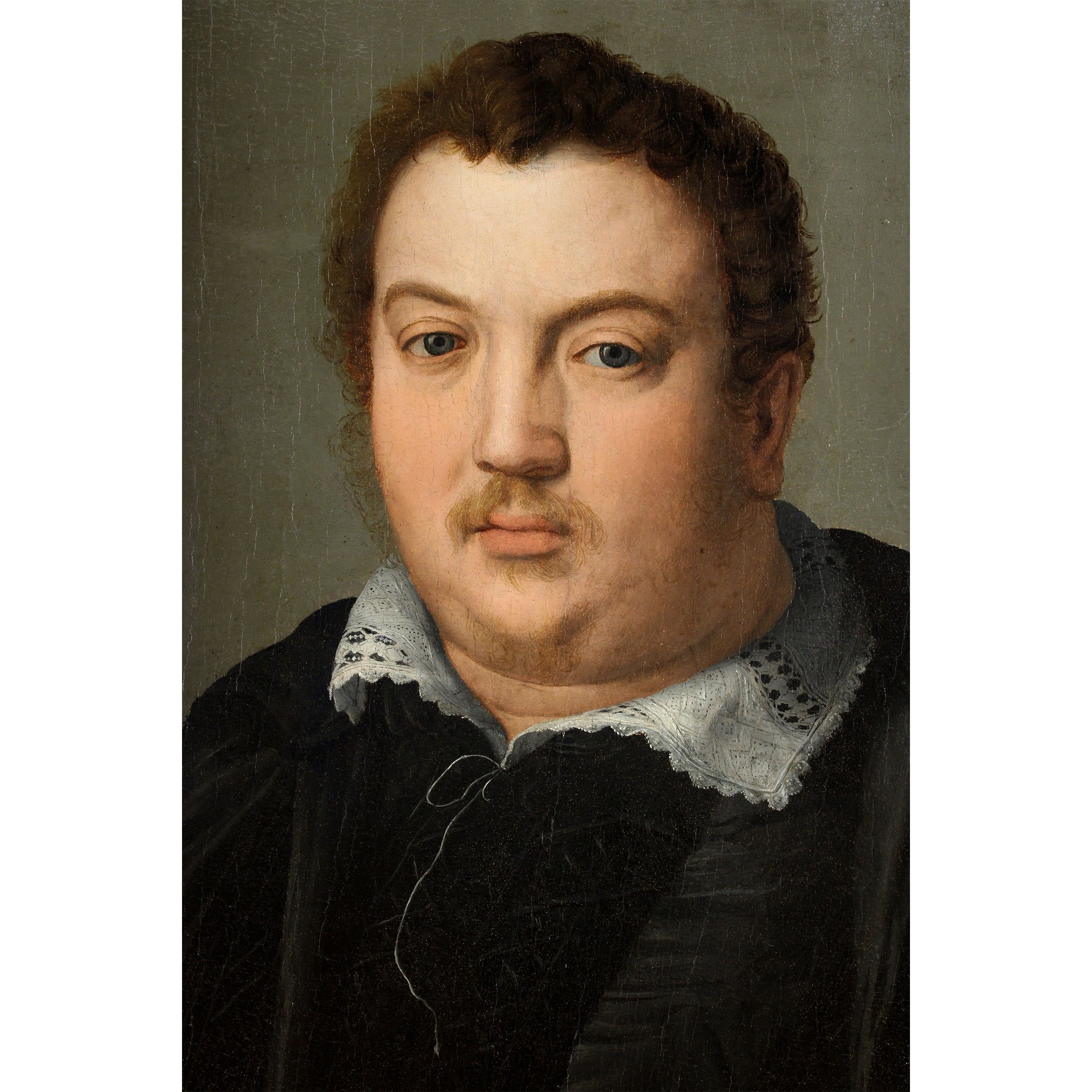 Firenze 1535-1607 Ritratto di gentiluomo con veste nera e cornice ovale nella mano destra, olio su tavola, entro cornice