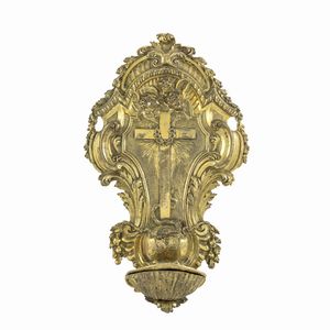 25x15 cm. Roma, XVIII Sec. sbalzato e cesellato con motivi vegetali, volute e teste di cherubini, vaschetta a [..]