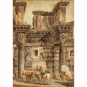 41x51 cm. Monte Porzio 1757 - Roma 1830 Veduta del Tempio della Fortuna Virile, 1814, acquerello su carta, firmato [..]