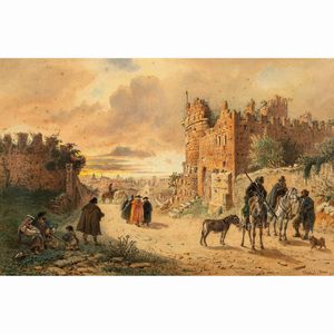 30x36 cm. Roma 1829 - 1906 Incontro nella campagna romana, acquerello su carta, firmato in basso a destra, entro [..]