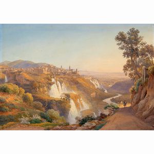 41,5x59,5 cm. Frascati 1844 - Roma 1905 Veduta di Tivoli, acquerello su carta, firmato e datato in basso a destra [..]
