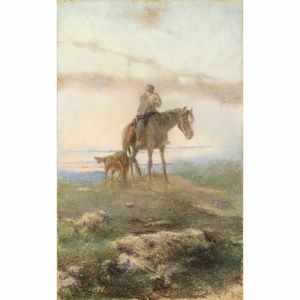 49x30 cm. Torino 1830 - Roma 1880 Scena di caccia, pastello su carta, siglato VB in basso a sinistra, entro c [..]