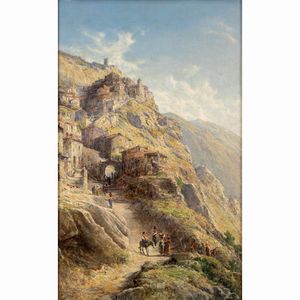 70,5x44 cm. Jersey 1825 - Londra 1905 Veduta di Anticoli Corrado con personaggi, olio su tela, firmato in basso [..]