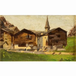 17,5x28 cm. Milano 1851 - 1936 Villaggio di montagna, 1896, olio su tela, firmato e datato in basso a destra, [..]
