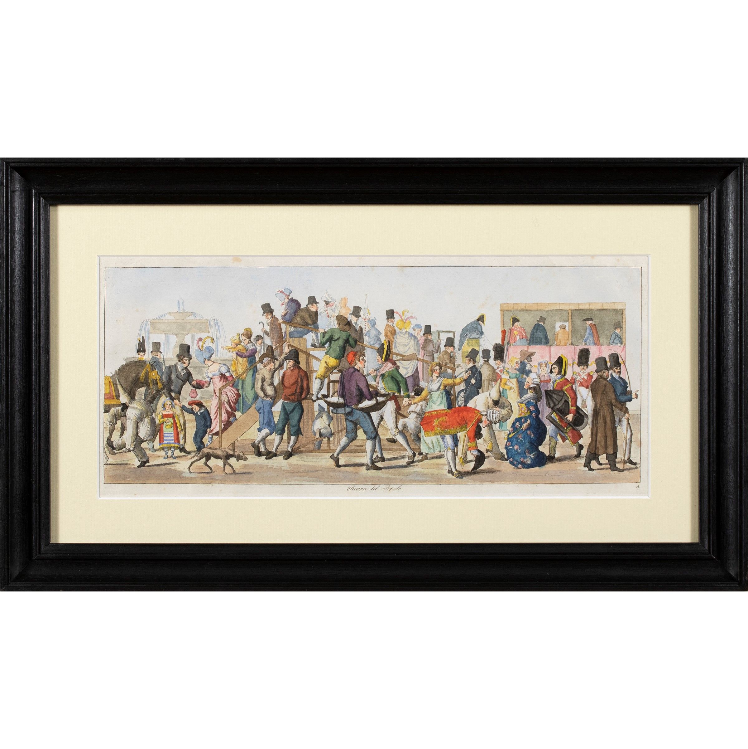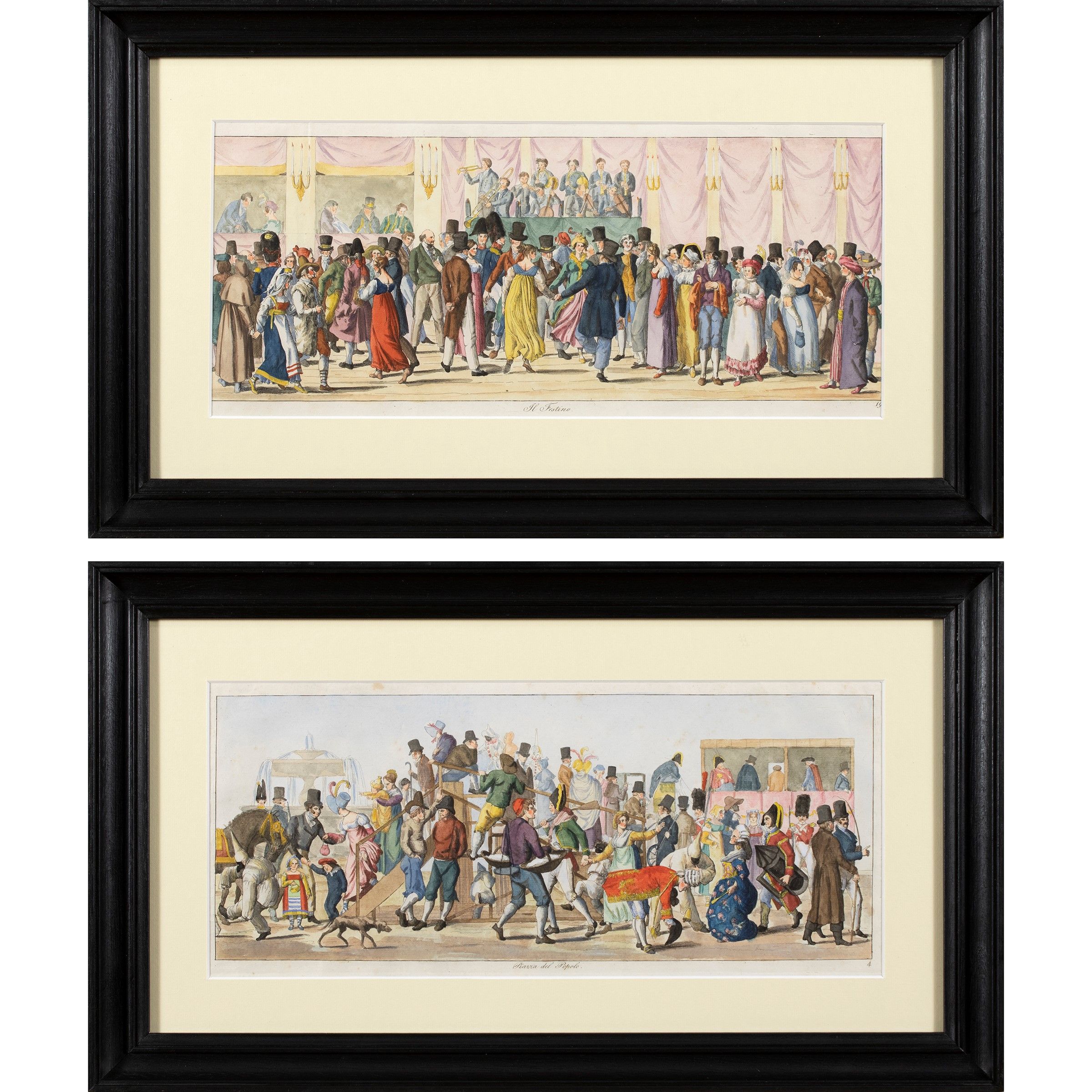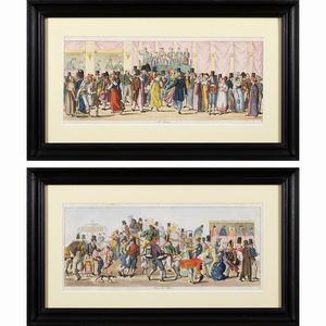 Stoccolma 1794 - Parigi 1837 Piazza del Popolo - Il Festino, 1820, coppia di acqueforti acquarellate, entro cornici