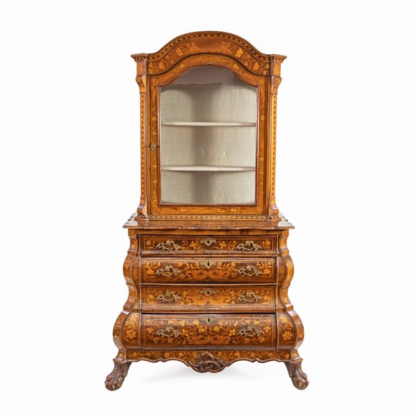 184x90x63 cm. Olanda, XIX Sec. interamente intarsiato con decoro floreale e vegetale, base mistilinea su piedi ferini e quattro cassetti con fronte mosso, alzata architettonica con vetri e ripiani interni rivestiti in tessuto, cimasa mistilinea