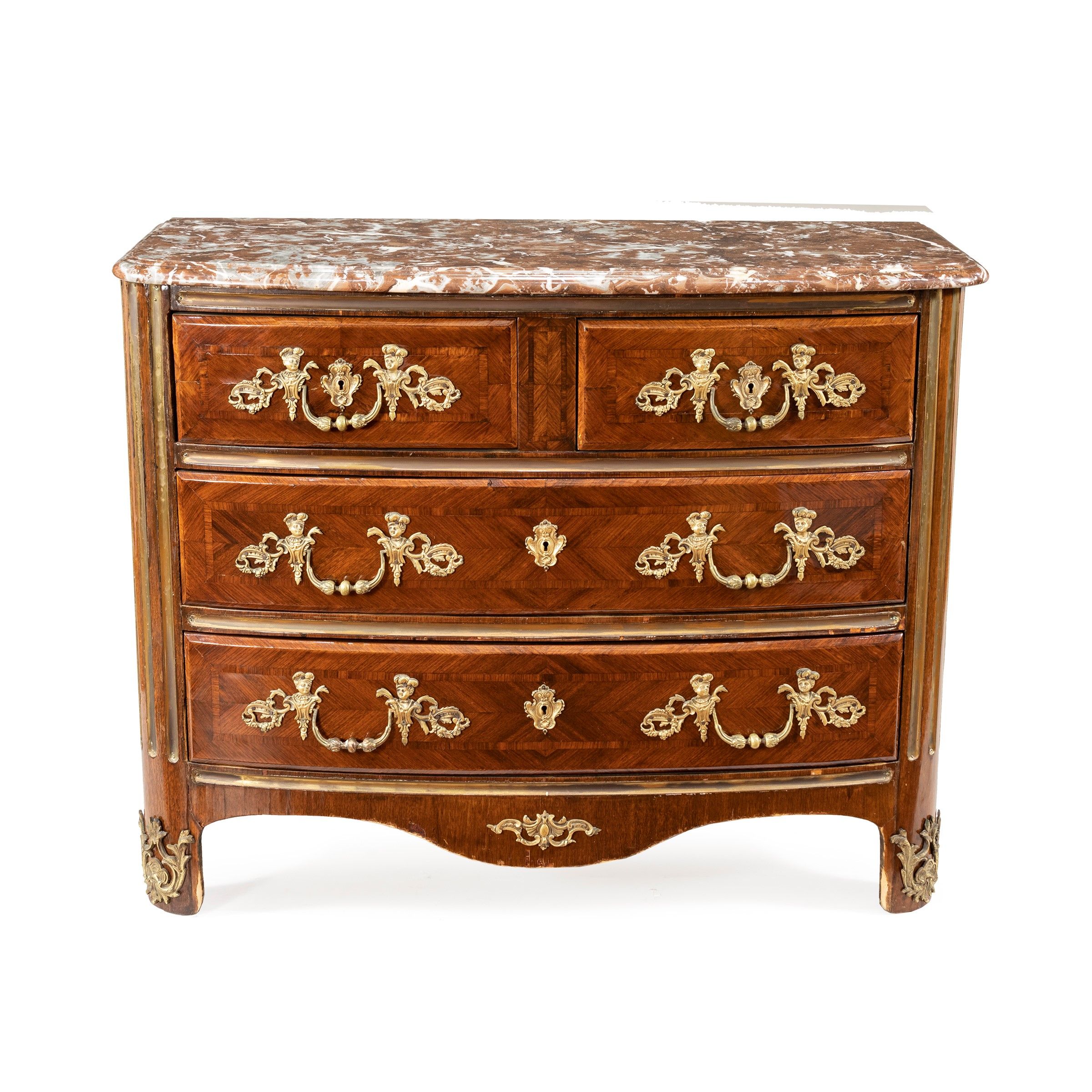 Francia, fine XVIII Sec. corpo di linea mossa, fronte a quattro cassetti, piano sagomato in marmo rosso di Francia, maniglie e fregi in bronzo dorato e cesellato, difetti