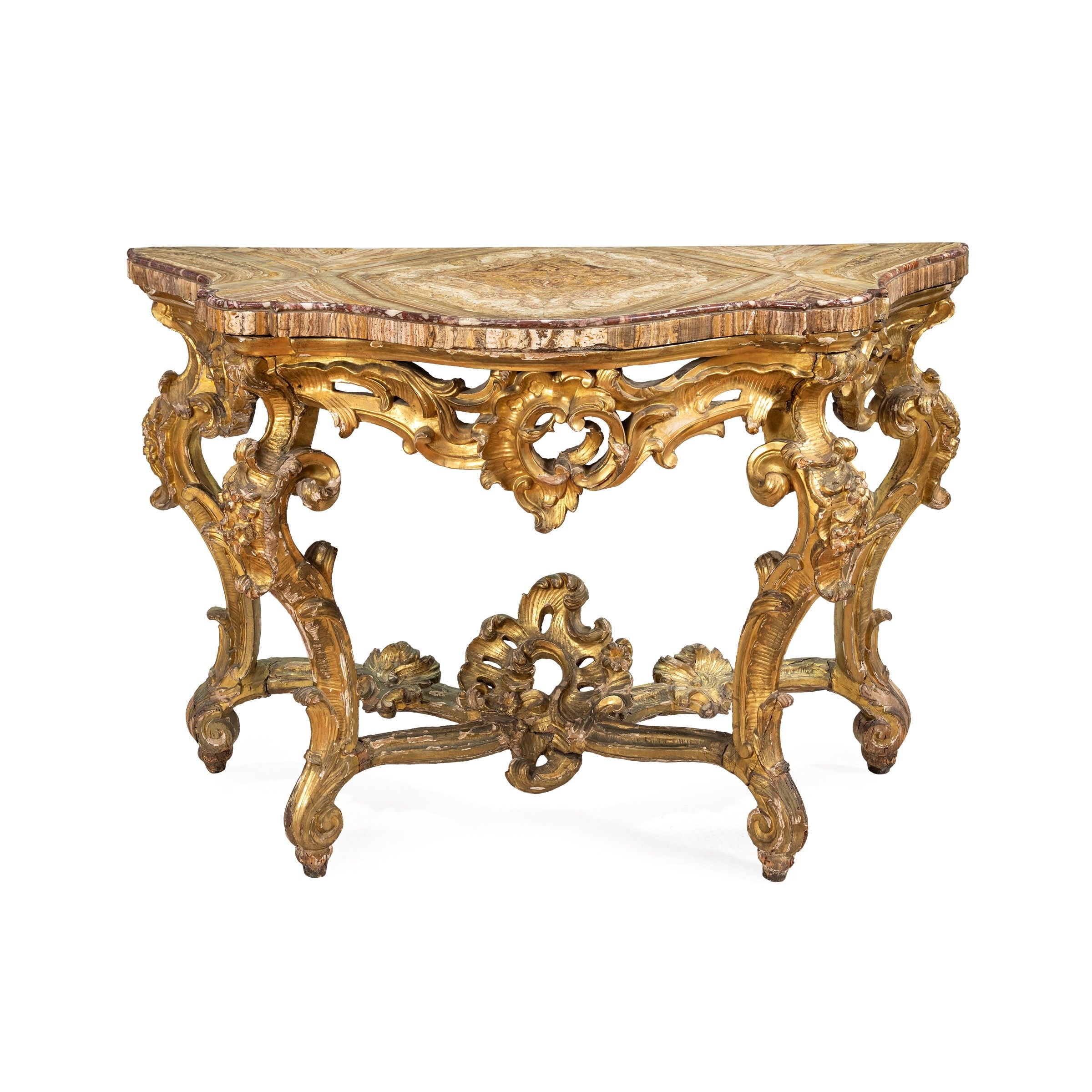 Roma, XVIII Sec. base in legno dorato, intagliato e traforato con motivi vegetali e floreali, gambe di linea mossa riunite da crociera, piano sagomato in alabastro fiorito, usure e lievi difetti