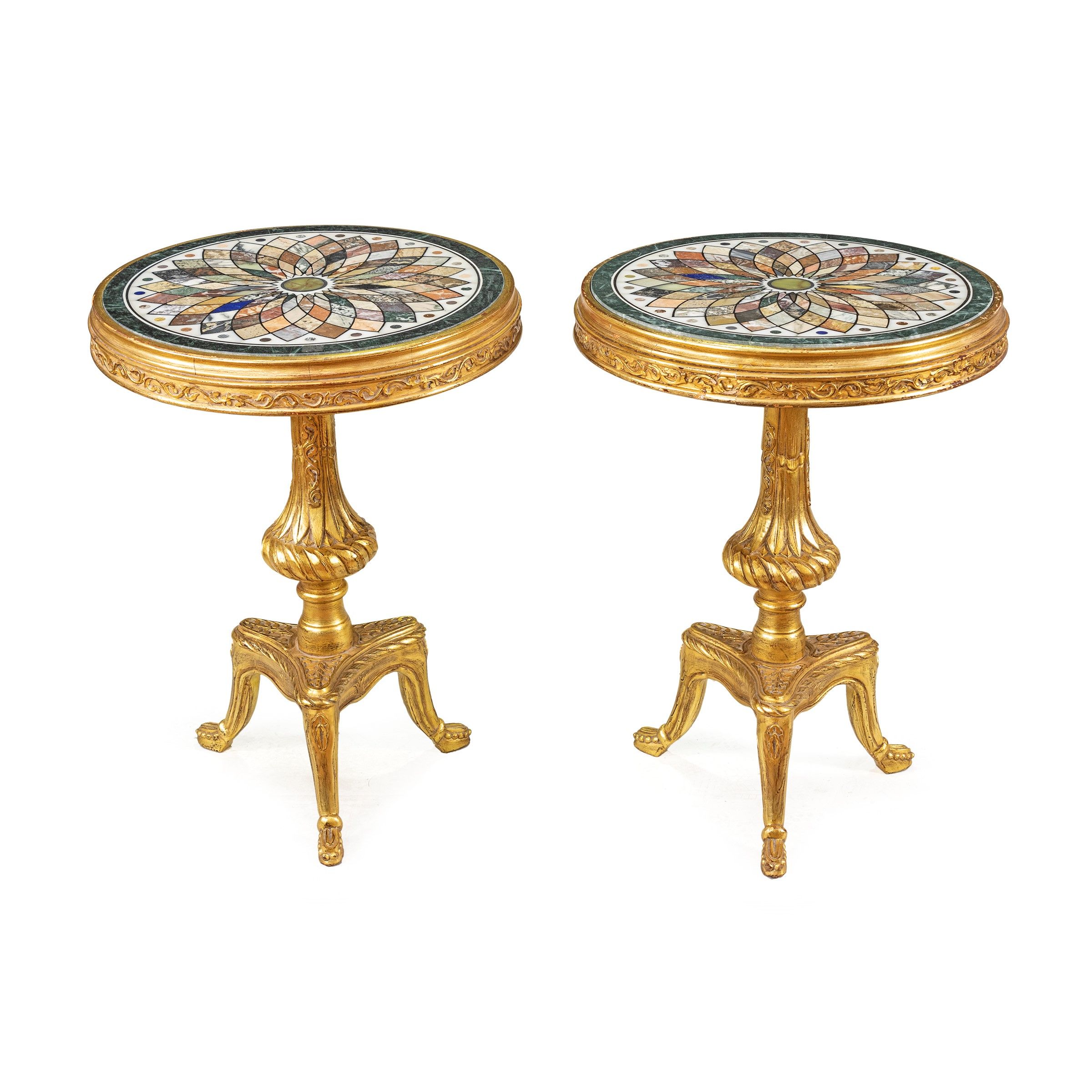 XIX-XX Sec. piani circolari realizzati con campionatura di marmi policromi, poggianti su basi a tripode in legno intagliato e dorato, lievi difetti