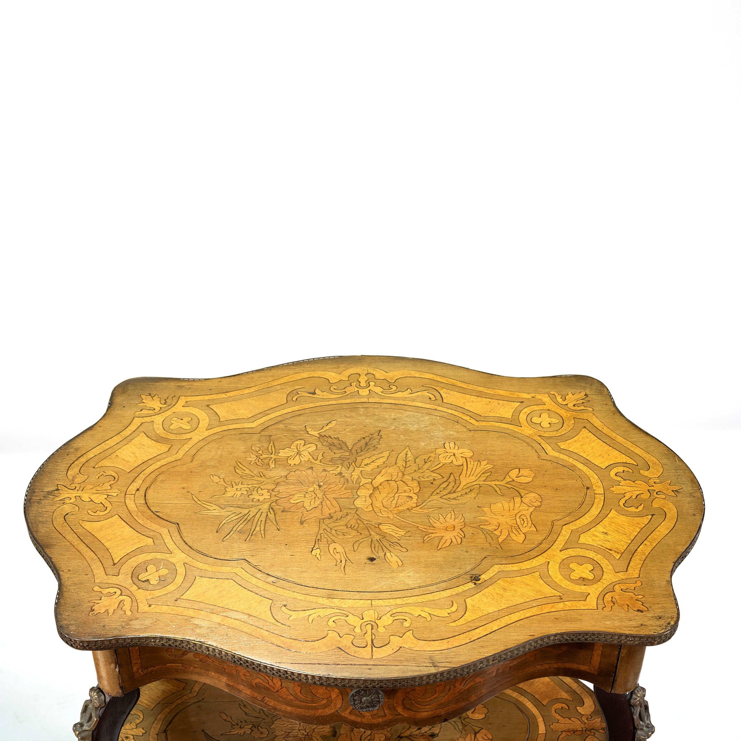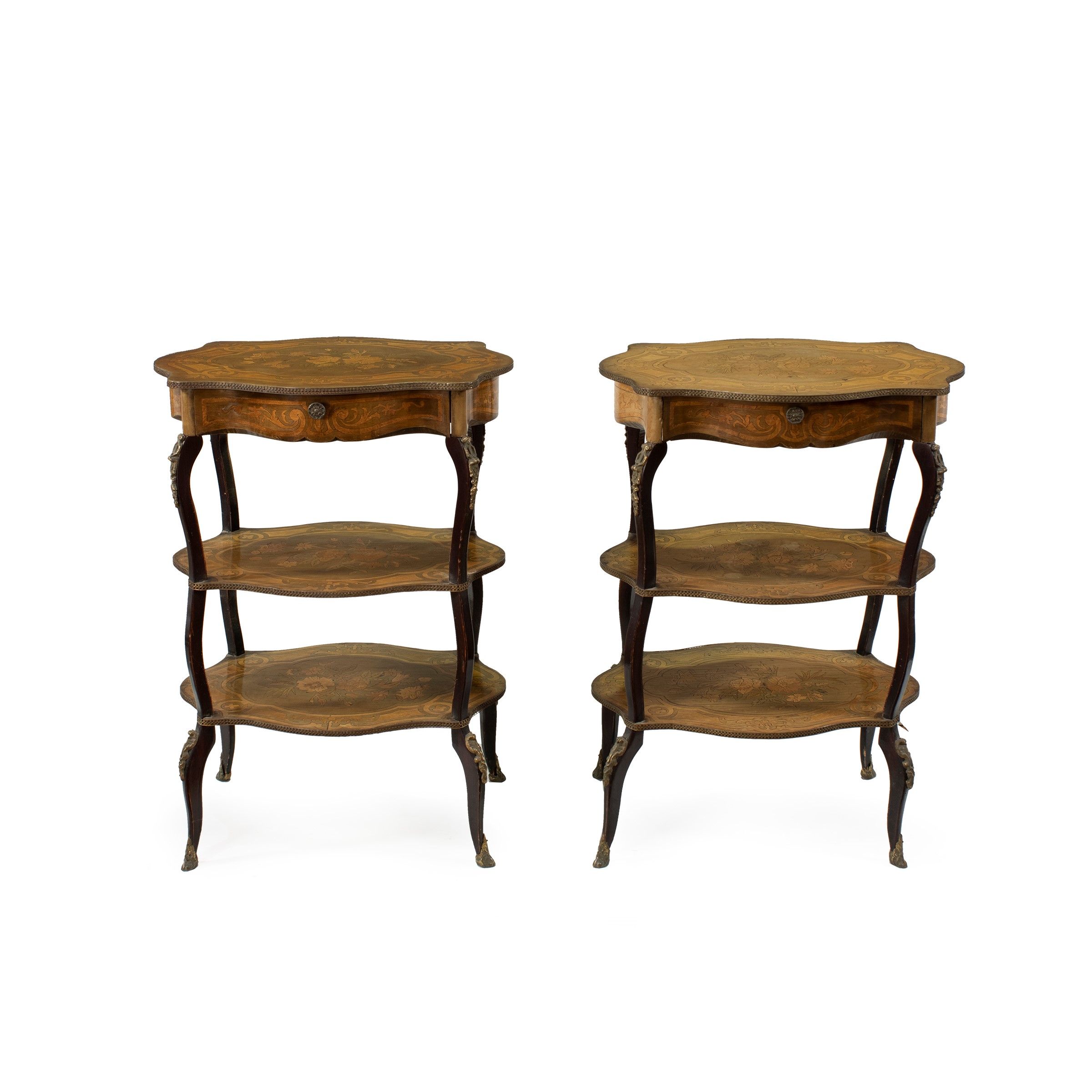 Francia, XX Sec. corpi sagomati intarsiati con motivi floreali e vegetali, struttura a tre ripiani sorretti da sostegni di linea sagomata, usure e lievi difetti