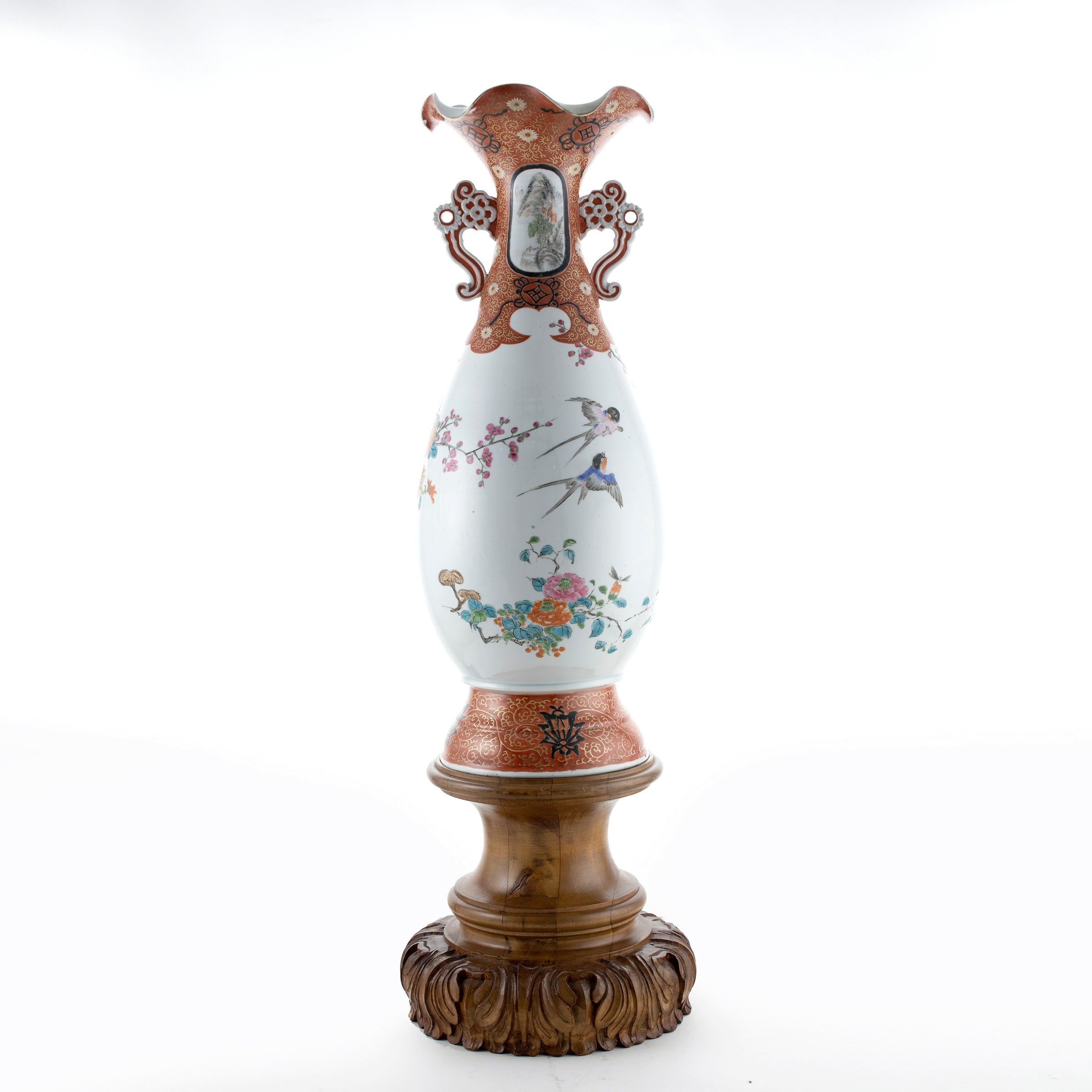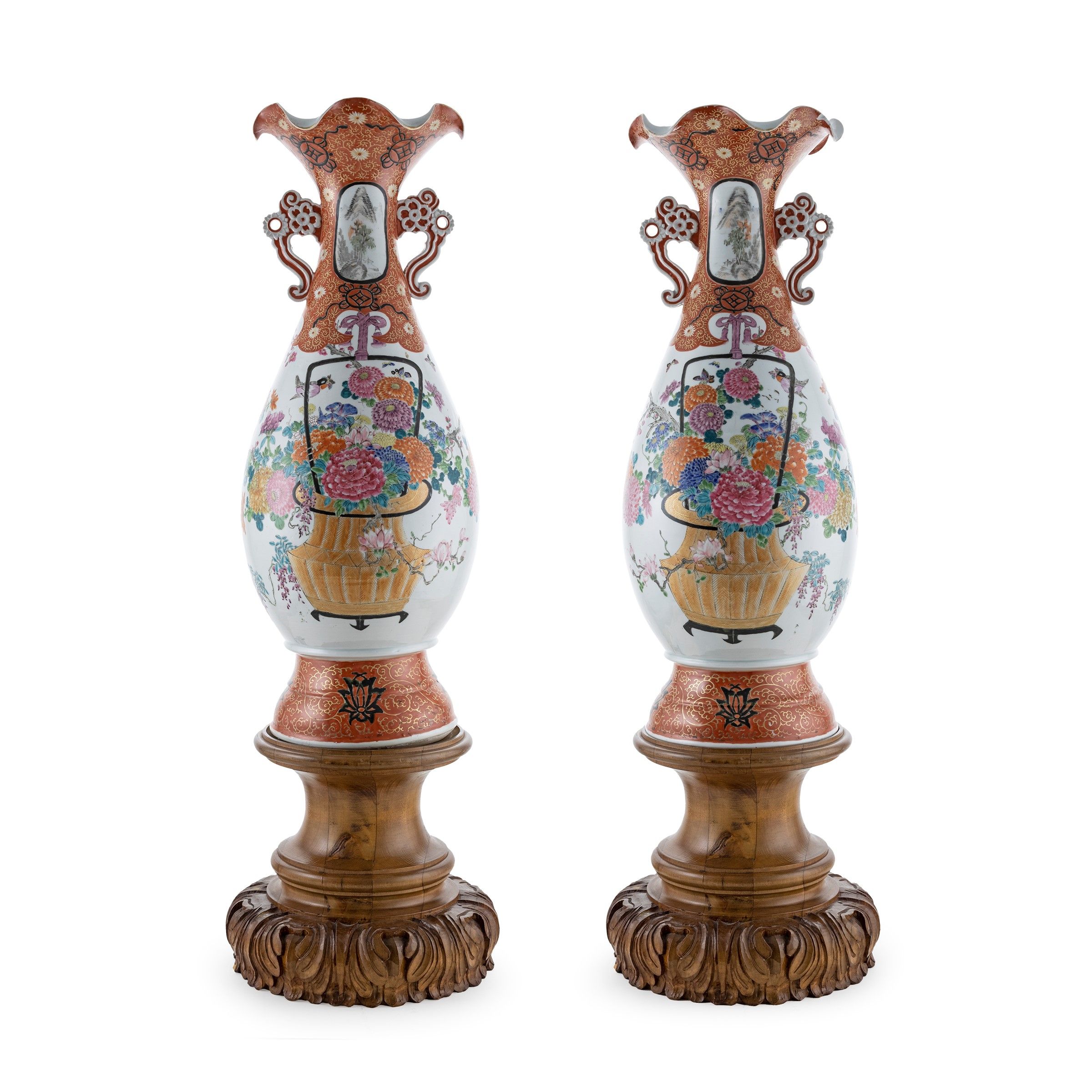 Giappone XIX-XX Sec. forma a balaustro, decorati con composizioni floreali entro vasi, farfalle e volatili, manici a voluta, poggianti su basi in legno di manifattura moderna