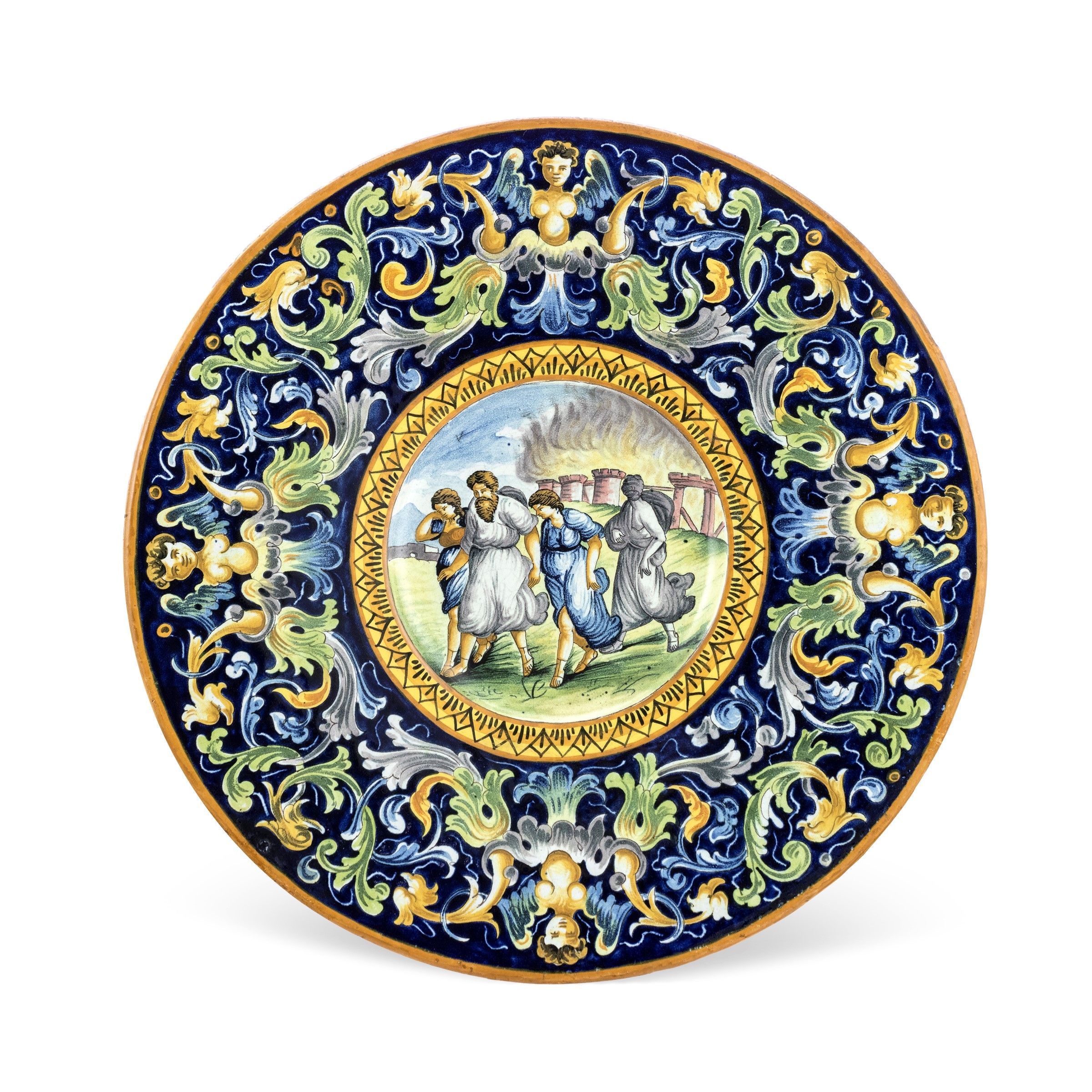 Napoli 1850 - 1885 piatto in ceramica policroma raffigurante scena d'incendio, marchio della manifattura