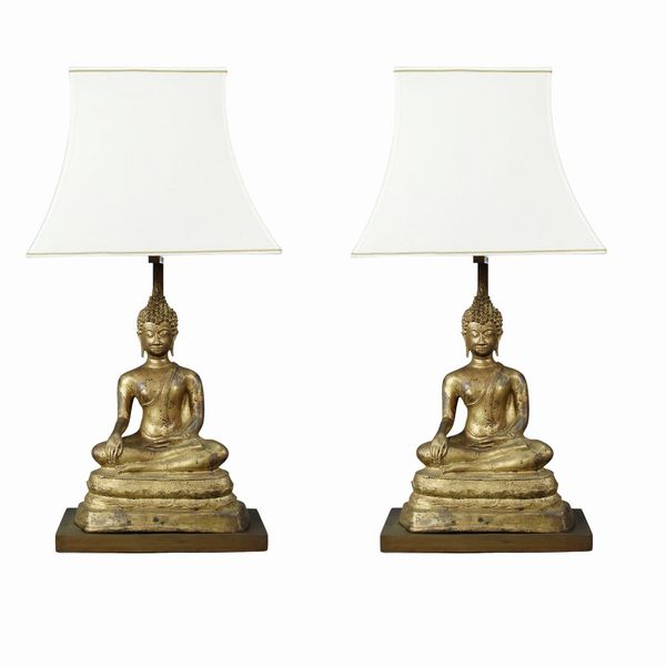 XX Sec. coppia di lampade in metallo e gesso, complete di paralume, lievi usure