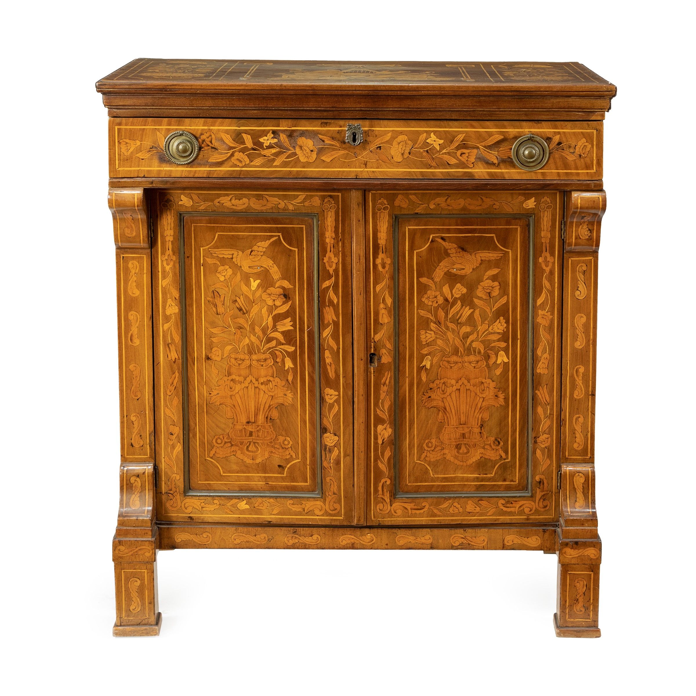 Olanda, fine XVIII Sec. corpo intarsiato con motivi floreali e vegetali, fronte con un cassetto e due sportelli sottostanti, piano rettangolare, usure e restauri