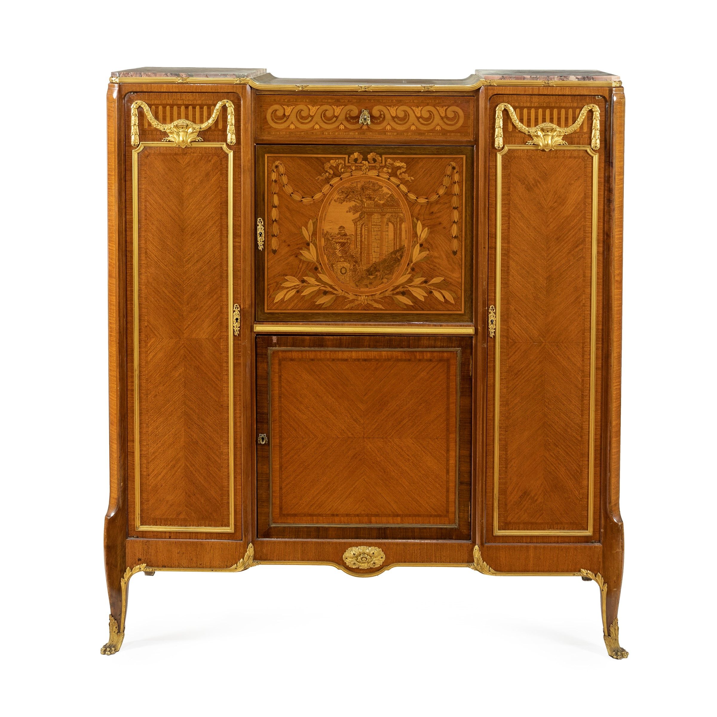 Francia, XIX Sec. corpo intarsiato a spina di pesce, sportello centrale decorato con un paesaggio e motivi vegetali, piani in marmo, decorazioni in bronzo cesellato e dorato