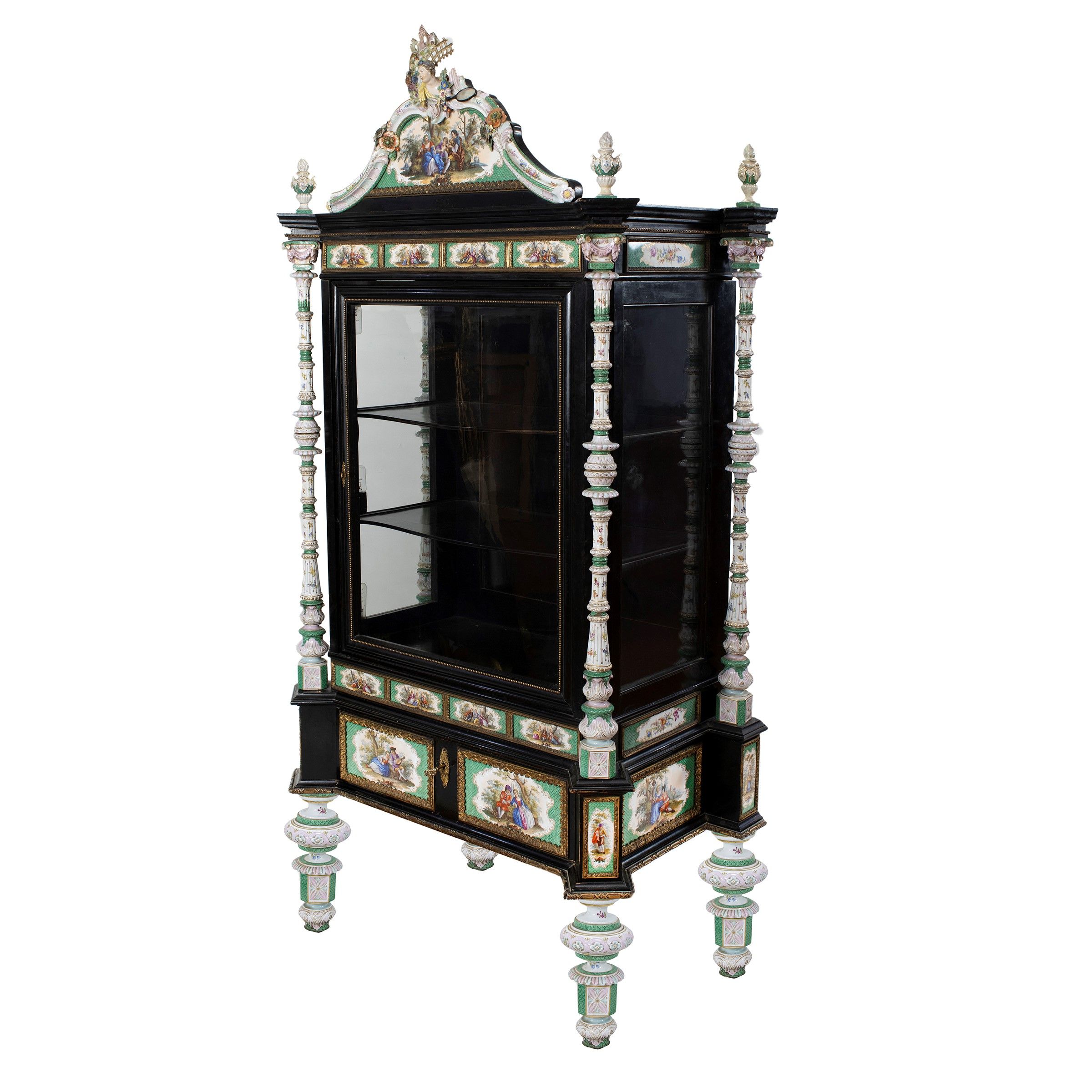 Manifattura europea, inizio XX Sec. struttura in legno ebanizzato e vetro, decorata con placche e colonne di porcellana policroma, dipinte a raffigurare scene galanti e motivi floreali e vegetali