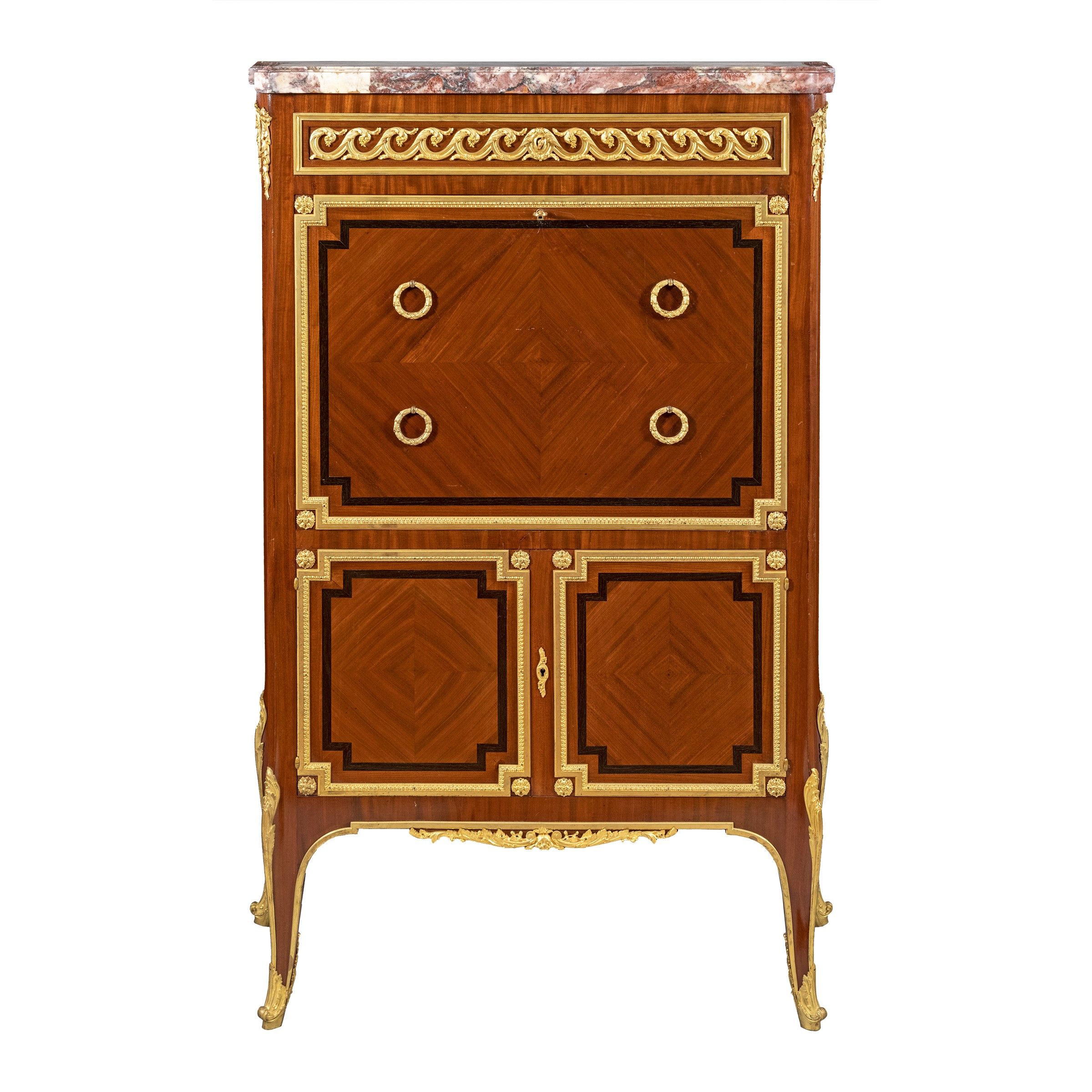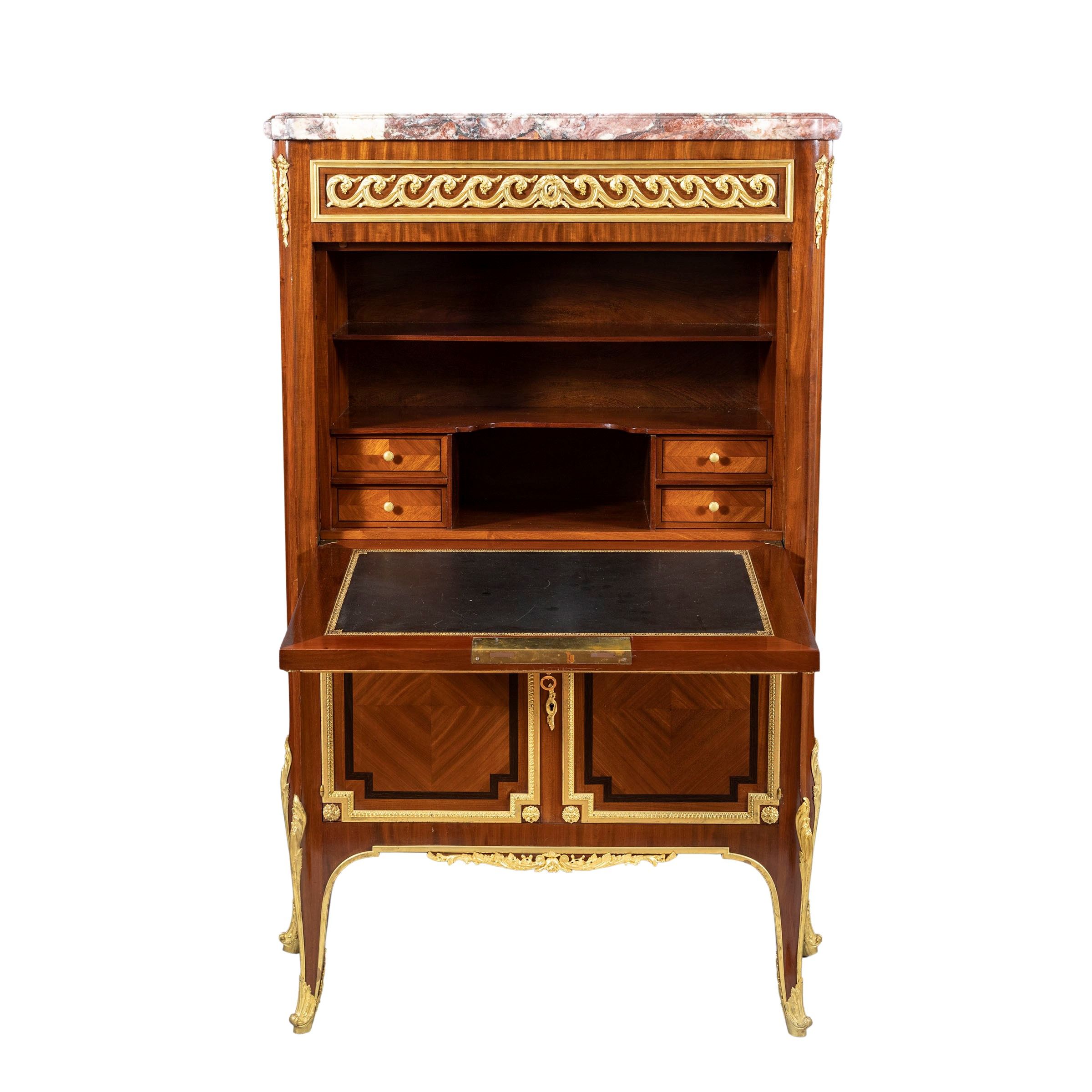 Francia, fine XIX Sec. mobile secretaire in mogano con applicazioni in bronzo dorato, piano superiore marmo in fior di pesco, un cassetto nella fascia decorato con motivi ad onde, sportello a calatoia, scarabattolo interno con cassetti e vani a giorno, due sportelli nella parte inferiore, gambe di linea mossa con scarpette a ricciolo in bronzo dorato, stampigliato a fuoco e firmato sulla serratura Sormani Paris 134 BV Hausmann
